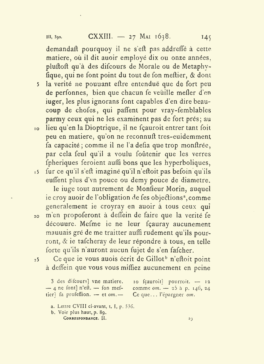 Ie vous remercie de l’Escrit du Reverend Pere G. ie le trouve tout pour moy, comme vous dites, et ie luy en ay obligation, mais ie n’ay garde de le faire imprimer, ny B 684, p. aucune chose de M. de Fermat, ou d’autres qui ne le desirent pas, ie suis trop éloigné de cette humeur ; Et ce qui m’a fait vous écrire, que ie ne desirois point qu’on m’envoyast rien, que ie ne pusse faire imprimer, a esté seulement pour obliger ceux qui me voudroient envoyer quelque chose, à le rendre meilleur, et m’exempter autant que ie pourrois de lire des sottises. Mais pour ceux qui nonobstant cela n’ont pas laissé de m’en envoyer, quelque permission qu’ils me donnent de les publier, ce n’est pas à dire que ie le fasse. Et si ie donne à imprimer quelques objections qu’on m’aura faites, ce seront seulement celles qui pourront estre de quelque utilité, et avoir quelque forces, et qui me pourroient cy-apres estre faites par d’autres ; sans me soucier davantage du reste, AT II, 148
