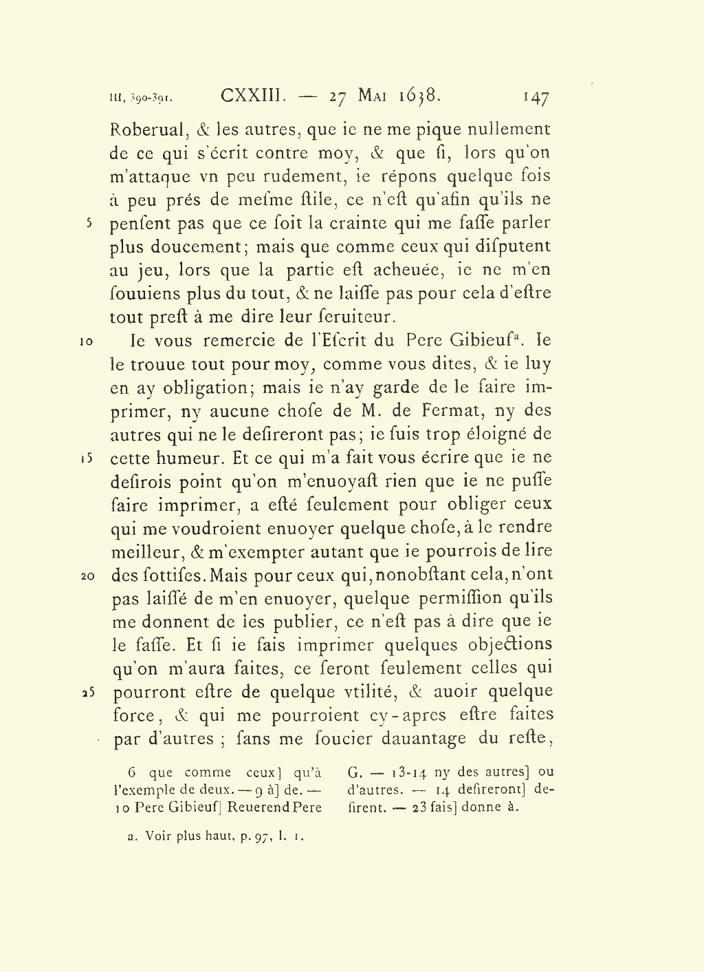 Roberval, et les autres, que ie ne me pique nullement de ce qui s’écrit contre moy, et que si Clerselier III, 391