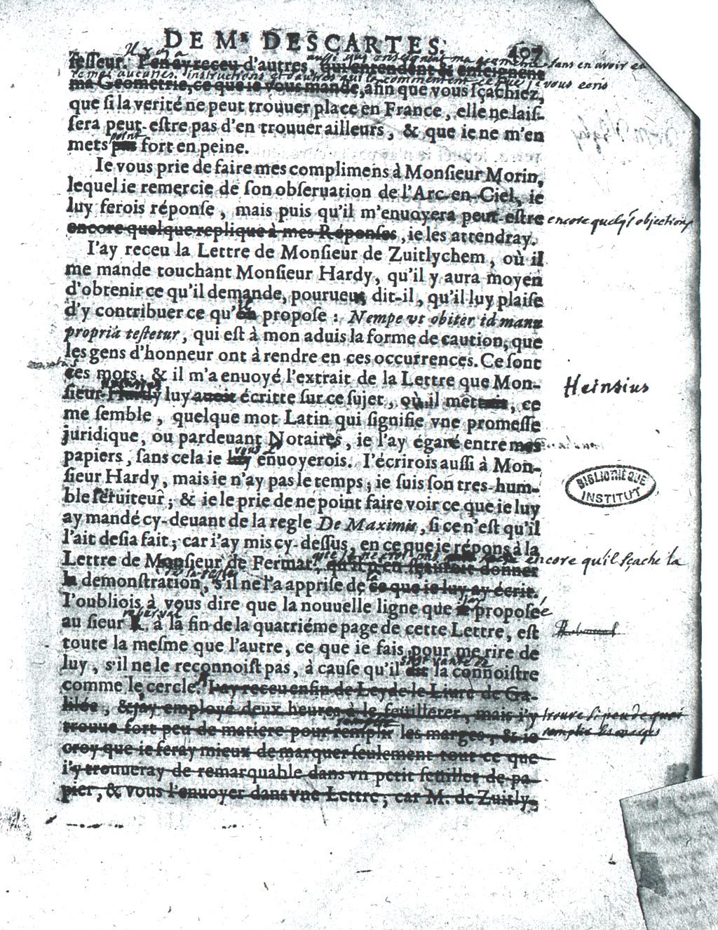 mandé cy-devant de la regle De maximis, si ce n’est qu’il l’ait desia fait ; car i’ay mis cy-dessus, en ce que ie répons à la Lettre de Monsieur de Fermat, qu’il n’en sçauroit donner la demonstration, s’il ne l’a apprise de ce que ie luy ay écrit. I’oubliois à vous dire que la nouvelle ligne que ie propose au sieur R. à la fin de la quatriéme page de cette Lettre, est toute la mesme que l’autre, ce que ie fais pour me rire de luy, s’il ne le reconnoist pas, à cause qu’il dit la connoistre comme le cercle. I’ay receu enfin de Leyde le Livre de Galilée, et ay employé deux heures à le feüilleter ; mais i’y trouve fort peu de matiere pour remplir les marges, et ie croy que ie feray mieux de marquer seulement tout ce que i’y trouveray de remarquable dans un petit feüillet de papier, et vous l’envoyer dans une Lettre, car M. de Zuitly Clerselier III, 408
