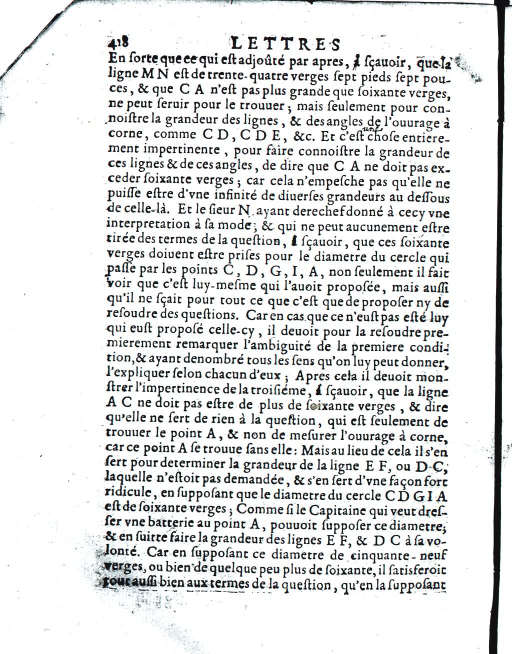 qu’elle ne puisse estre d’une infinité de diverses grandeurs au dessous de celle-là. Et le sieur N. ayant derechef donné à cecy une interpretation à sa mode, et qui ne peut aucunement estre tirée des termes de la question, à sçavoir, que ces soixante verges doivent estre prises pour le diametre du cercle qui passe par les points C, D, G, I, A, non seulement il fait voir que c’est luy-mesme qui l’avoit proposée, mais aussi qu’il ne sçait pour tout ce que c’est que de proposer ny de resoudre des questions. Car en cas que ce n’eust pas esté luy qui eust proposé celle-cy, il devoit pour la resoudre premierement remarquer l’ambiguité de la premiere condition, et ayant denombré tous les sens qu’on luy peut donner, l’expliquer selon chacun d’eux ; Apres cela il devoit monstrer l’impertinence de la troisiéme, à sçavoir, que la ligne AC ne doit pas estre de plus de soixante verges, et dire qu’elle ne sert de rien à la question, qui est seulement de trouver le point A, et non de mesurer l’ouvrage à corne, car ce point A se trouve sans elle : Mais au lieu de cela il s’en sert pour determiner la grandeur de la ligne EF, ou DC, laquelle n’estoit pas demandée, et s’en sert d’une façon fort ridicule, en supposant que le diametre du cercle CDGIA est de soixante verges ; Comme si le Capitaine qui veut dresser une batterie au point A, pouvoit supposer ce diametre ; et en suitte faire la grandeur des lignes EF, et DC à sa volonté. Car en supposant ce diametre de cinquante-neuf verges, ou bien de quelque peu plus de soixante, il satisferoit tout aussi bien aux termes de la question, AT II, 604