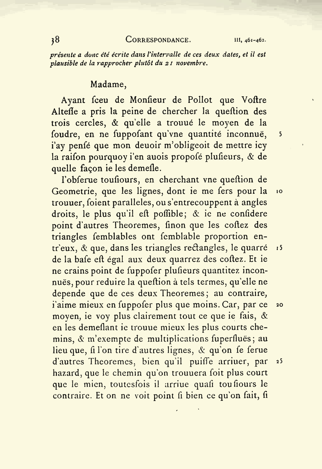 Ayant sceu de Monsieur de Pollot que Vostre Altesse a pris la peine de chercher la question dedes trois cercles, et qu’elle a trouvé le moyen de la soudre, en ne supposant qu’une quantité inconnuë, i’ay pensé que mon devoir m’obligeoit de mettre icy la raison pourquoy i’en avois proposé plusieurs, et de quelle façon ie les demesle.
