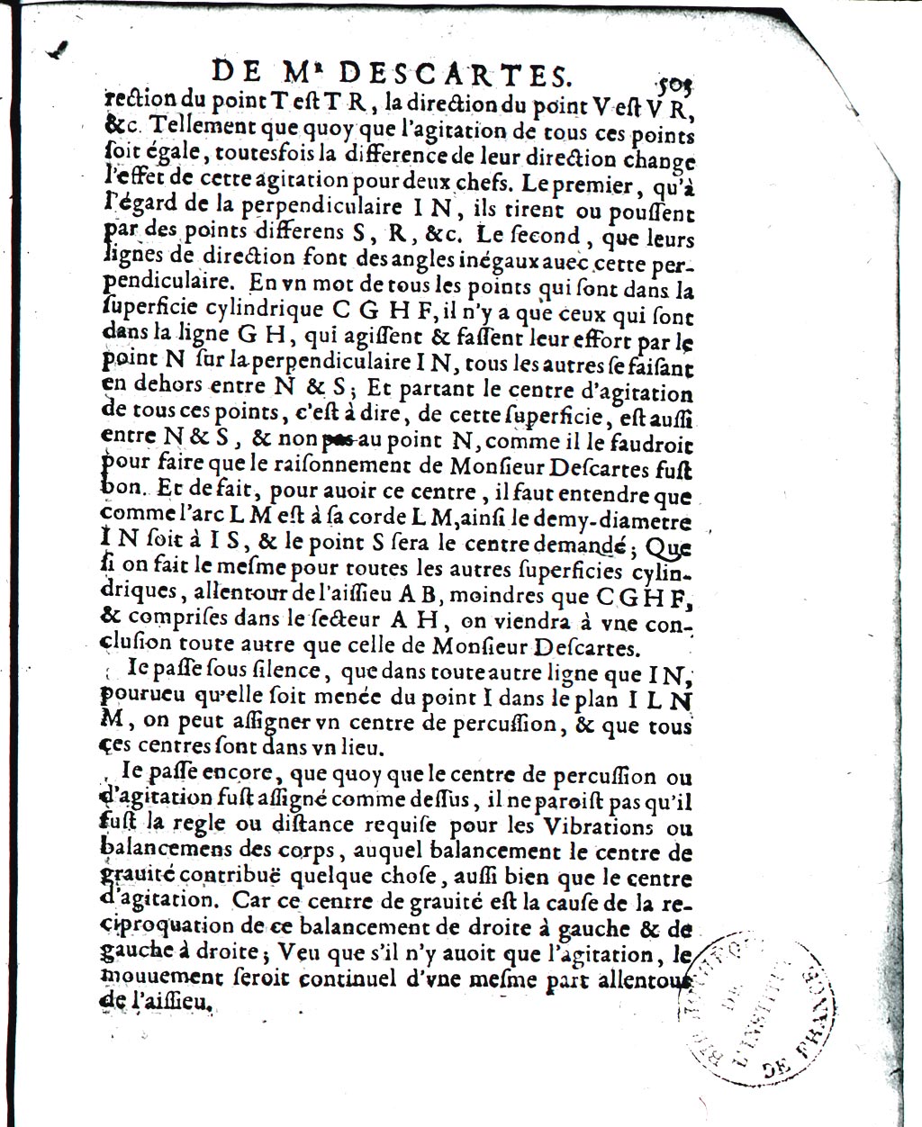 Ie passe encore, que quoy que le centre de percussion ou d’agitation fust assigné comme dessus, il ne paroist pas qu’il fust la regle ou distance requise pour les Vibrations ou balancemens des corps, auquel balancement le centre de gravité contribuë quelque chose, aussi bien que le centre d’agitation. Car ce centre de gravité est la cause de la reciproquation de ce balancement de droite à gauche et de gauche à droite ; Veu que s’il n’y avoit que l’agitation, le mouvement seroit continuel d’une mesme part allentour de l’aissieu.