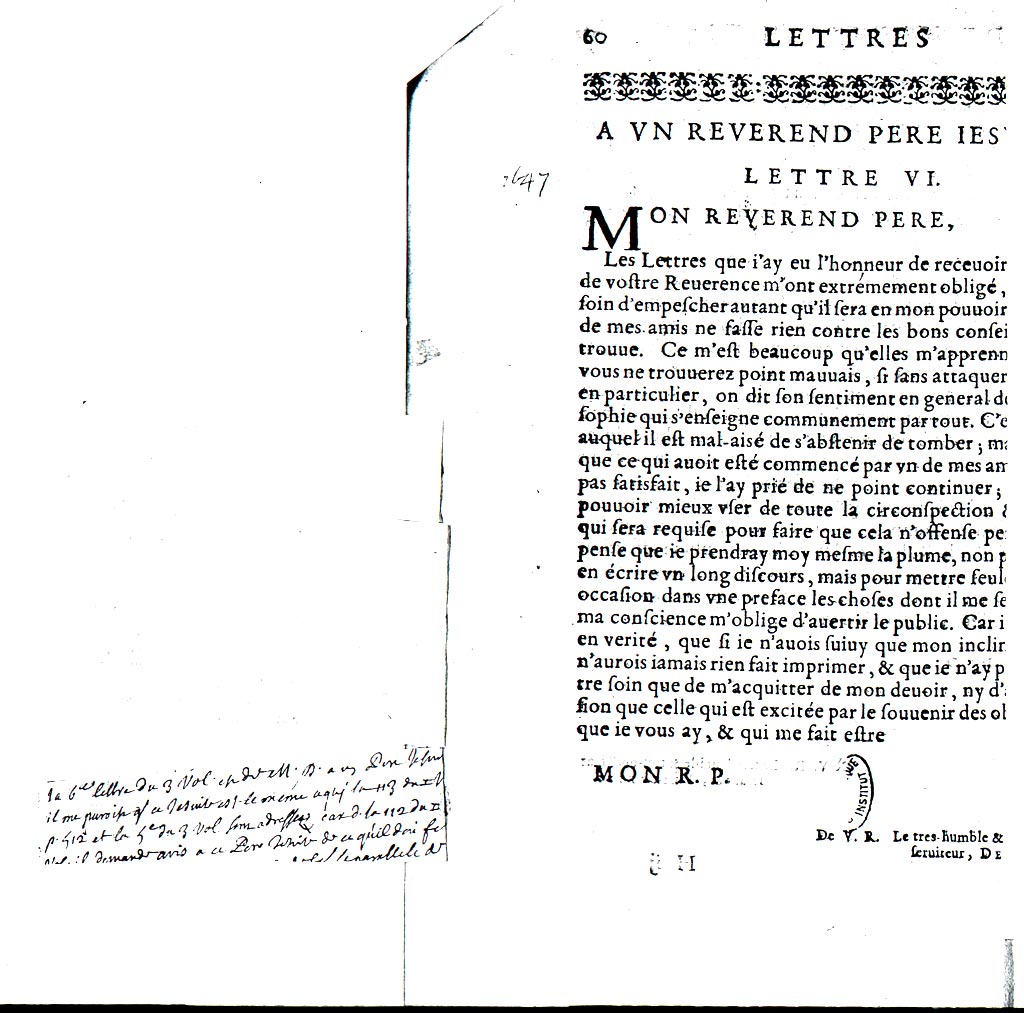 Les Lettres que i’ay eu l’honneur de recevoir de la part de vostre Reverence m’ont extrémement obligé, et i’auray soin d’empescher autant qu’il sera en mon pouvoir, qu’aucun de mes amis ne fasse rien contre les bons conseils que i’y trouve. Ce m’est beaucoup qu’elles m’apprennent, que vous ne trouverez point mauvais, si sans attaquer personne en particulier, on dit son sentiment en general de la Philosophie qui s’enseigne communement partout. C’est un sujet auquel il est mal-aisé de s’abstenir de tomber ; mais AT IV, 588
