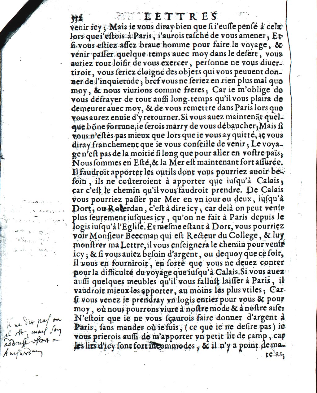 et si vous aviez besoin d’argent, ou dequoy que ce soit, il vous en fourniroit, en sorte que vous ne devez conter pour la difficulté du voyage que iusqu’à Calais. Si vous avez aussi quelques meubles qu’il vous fallust laisser à Paris, il vaudroit mieux les apporter, au moins les plus utiles ; Car si vous venez ie prendray un logis entier pour vous et pour moy, où nous pourrons vivre à nostre mode et à nostre aise : N’estoit que ie ne vous sçaurois faire donner d’argent à Paris, sans mander où ie suis, (ce que ie ne desire pas) ie vous prierois aussi de m’apporter un petit lit de camp, car les lits d’icy sont fort incommodes, et il n’y a point de matelas ; Clerselier III, 553