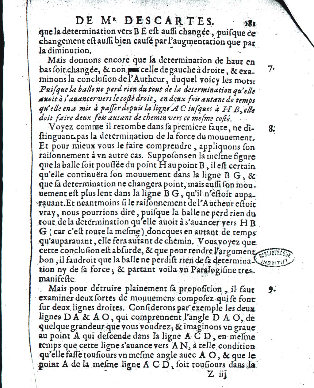 7.Mais donnons encore que la determination de haut en bas soit changée, et non pas celle de gauche à droite, et examinons la conclusion de l’Autheur, duquel voicy les mots : Puisque la balle ne perd rien du tout de la determination qu’elle avoit à s’avancer vers le AT I, 468