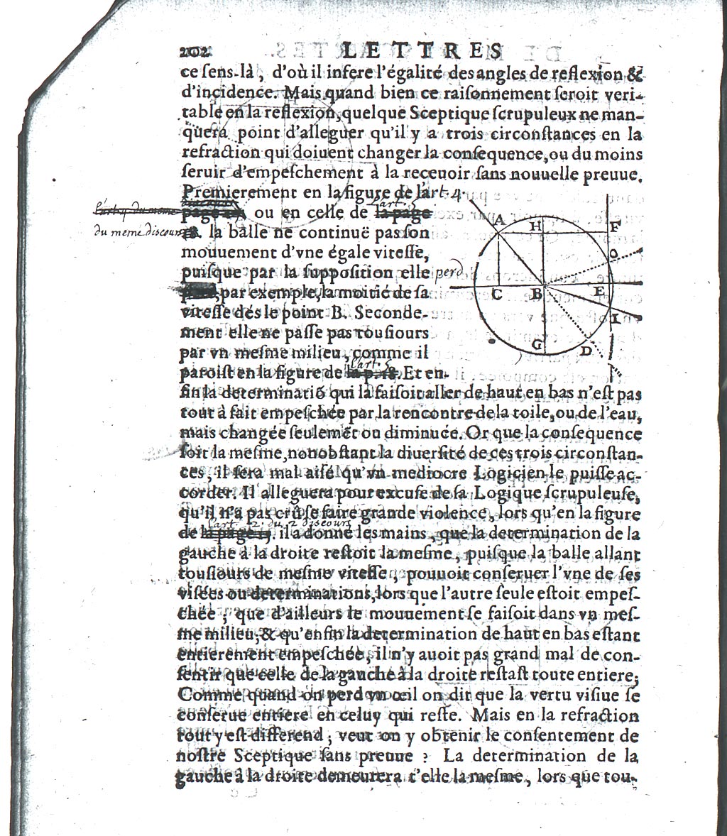 Premierement en la figure de la page 17. ou en celle de la page 18. la balle ne continuë pas son mouvement d’une égale vitesse, puisque par la supposition elle pert, par exemple, la moitié de sa vitesse dés le point B. Secondement elle ne passe pas tousiours par un mesme milieu, comme il paroist en la figure de la p. 18. Et enfin la determination qui la faisoit aller de haut en bas n’est pas tout à fait empeschée par la rencontre de la toile, ou de l’eau, mais changée seulement ou diminuée. Or que la consequence soit la mesme, nonobstant la diversité de ces trois circonstances, il sera mal-aisé qu’un mediocre Logicien le puisse accorder. Il alleguera pour excuse de sa Logique scrupuleuse, qu’il n’a pas crû se faire grande violence, lors qu’en la figure de la page 15. il a donné les mains, que la determination de la gauche à la droite restoit la mesme, puisque la balle allant tousiours de mesme vitesse, pouvait conserver l’une de ses visées ou determinations, lors que l’autre seule estoit empeschée ; que d’ailleurs le mouvement se faisoit dans un mesme milieu ; et qu’enfin la determination de haut en bas estant entierement empeschée, il n’y avoit pas grand mal de consentir que celle de la gauche à la droite restast toute entiere ; Comme quand on perd un œil on dit que la vertu visive se conserve toute entiere en celuy qui reste. Mais en la refraction tout y est differend ; veut on y obtenir la consentement de nostre Sceptique sans preuve ? La determination de la gauche à la droite demeurera-t’elle la mesme, lors que toutes Clerselier III, 203