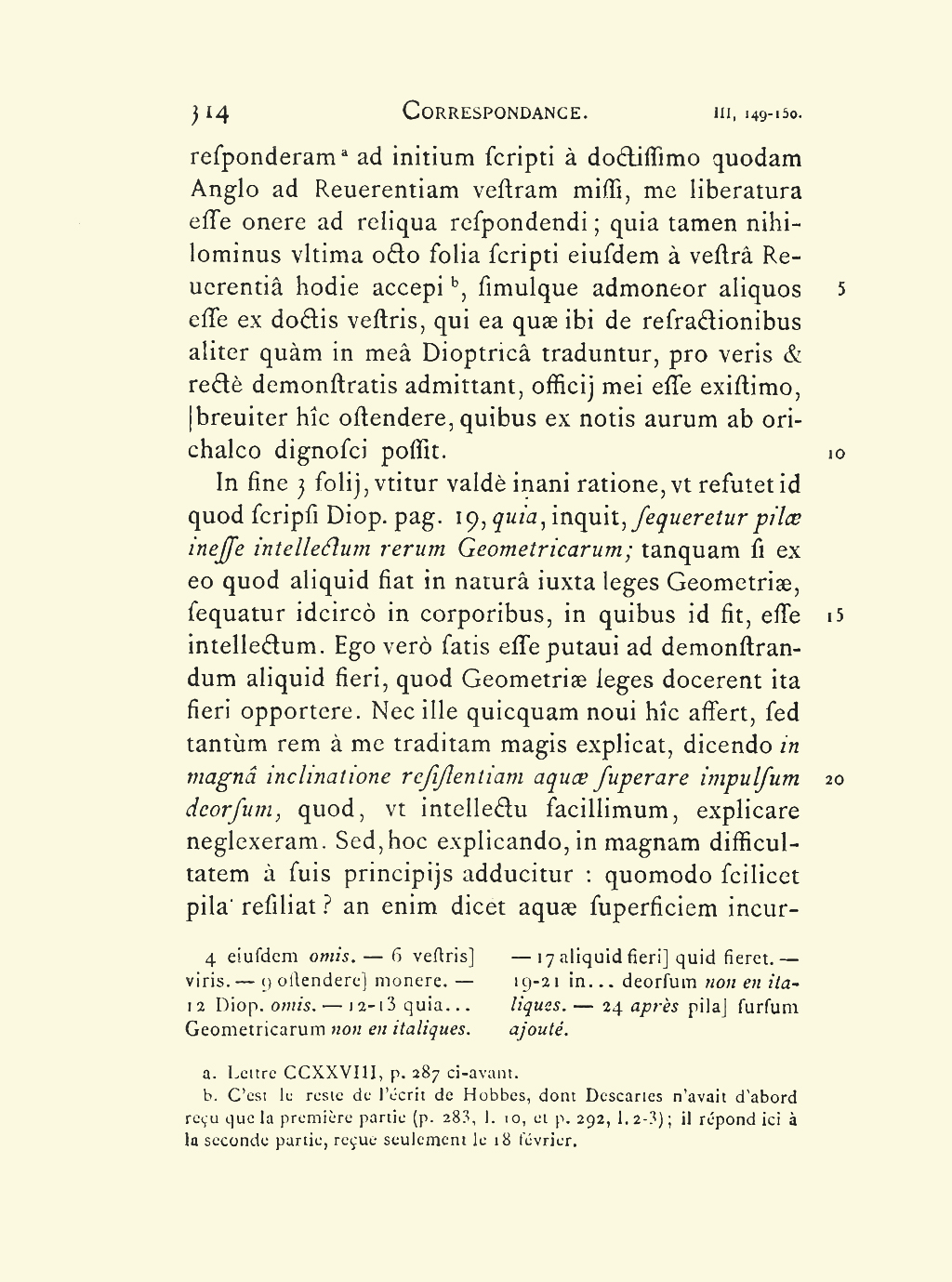 In fine 3. folij utitur valde inani ratione, ut refutet id quod scripsi pag. 19. quia inquit, sequeretur pilæ inesse intellectum rerum Geometricarum ; tanquam si ex eo quod aliquid fiat in natura iuxta leges Geometriæ, sequatur idcircò in corporibus in quibus id fit esse intellectum. Ego vero satis esse putavi ad demonstrandum quid fieret, quod Geometriæ leges docerent ita fieri opportere ; Nec ille quicquam novi hîc affert, sed tantum rem à me traditam magis explicat, dicendo in magna inclinatione resistentiam aquæ superare impulsum deorsum, quod, ut intellectu facillimum, explicare neglexeram ; Sed hoc explicando in magnam difficultatem à suis principiis adducitur ; Quomodo scilicet pila sursum resiliat ; an enim dicet aquæ superficiem incurvari AT III, 315