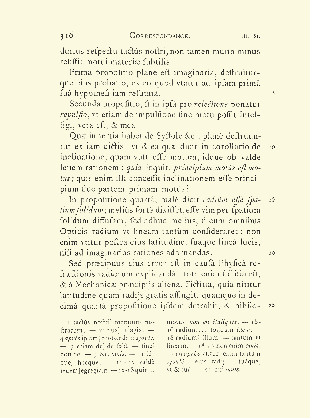 Sed præcipuus eius error est in causâ Physicâ refractionis radiorum explicandâ : tota enim fictitia est, et à mechanicæ principiis aliena. Fictitia, quia nititur latitudine quam radiis gratis affingit, quamque in decimâ quartâ propositione iisdem detrahit, et nihilo AT III, 317
