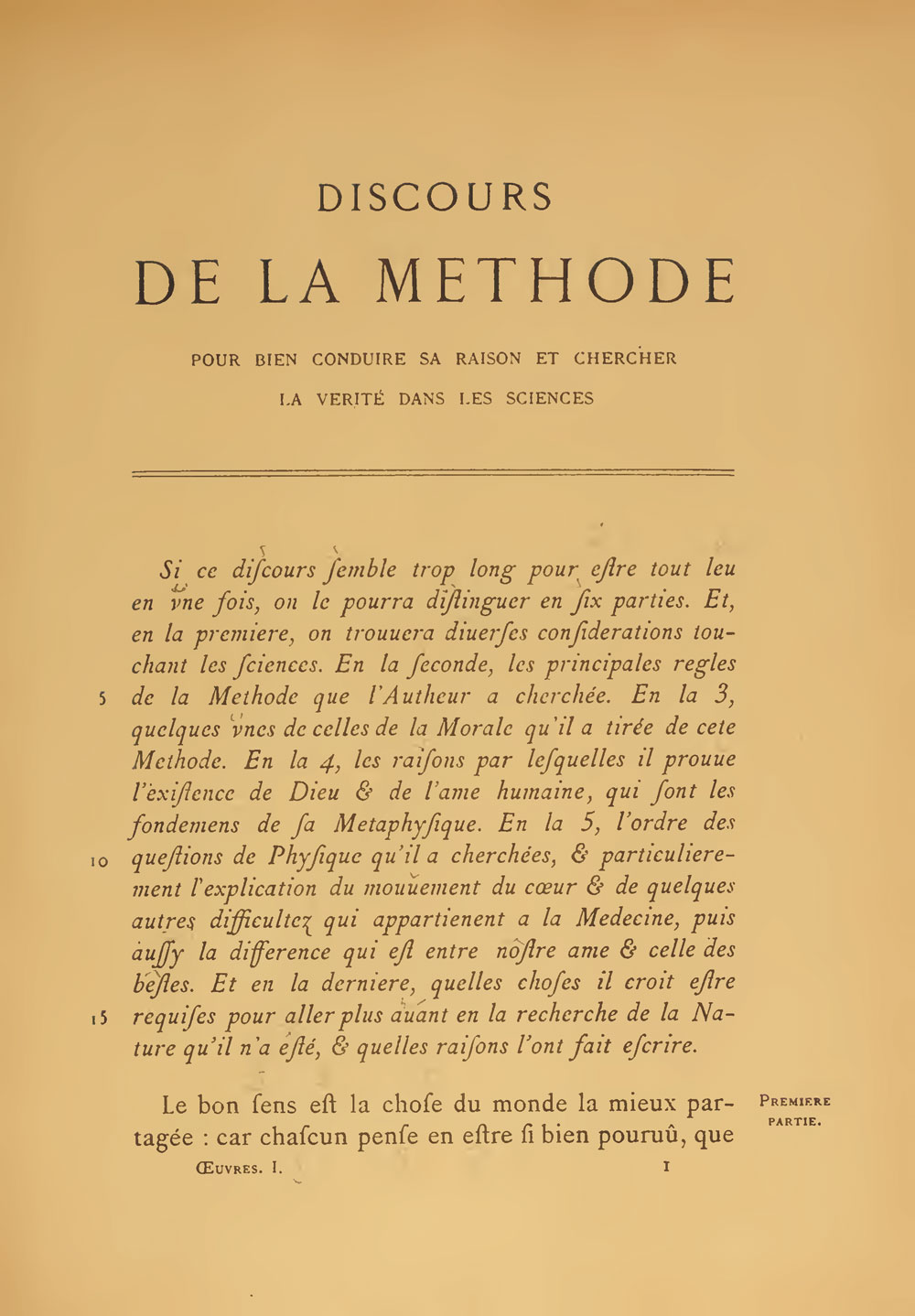 Si ce discours semble trop long ponur estre tout leu en vne fois, on le pourra distinguer en six parties. Et en la premiere on trouuera diuerses considerations touchant les sciences. En la seconde, les principales regles de la Methode que l’Autheur a cherchée. En la 3, quelques vnes de celles de la Morale qu’il a tirée de cete Methode