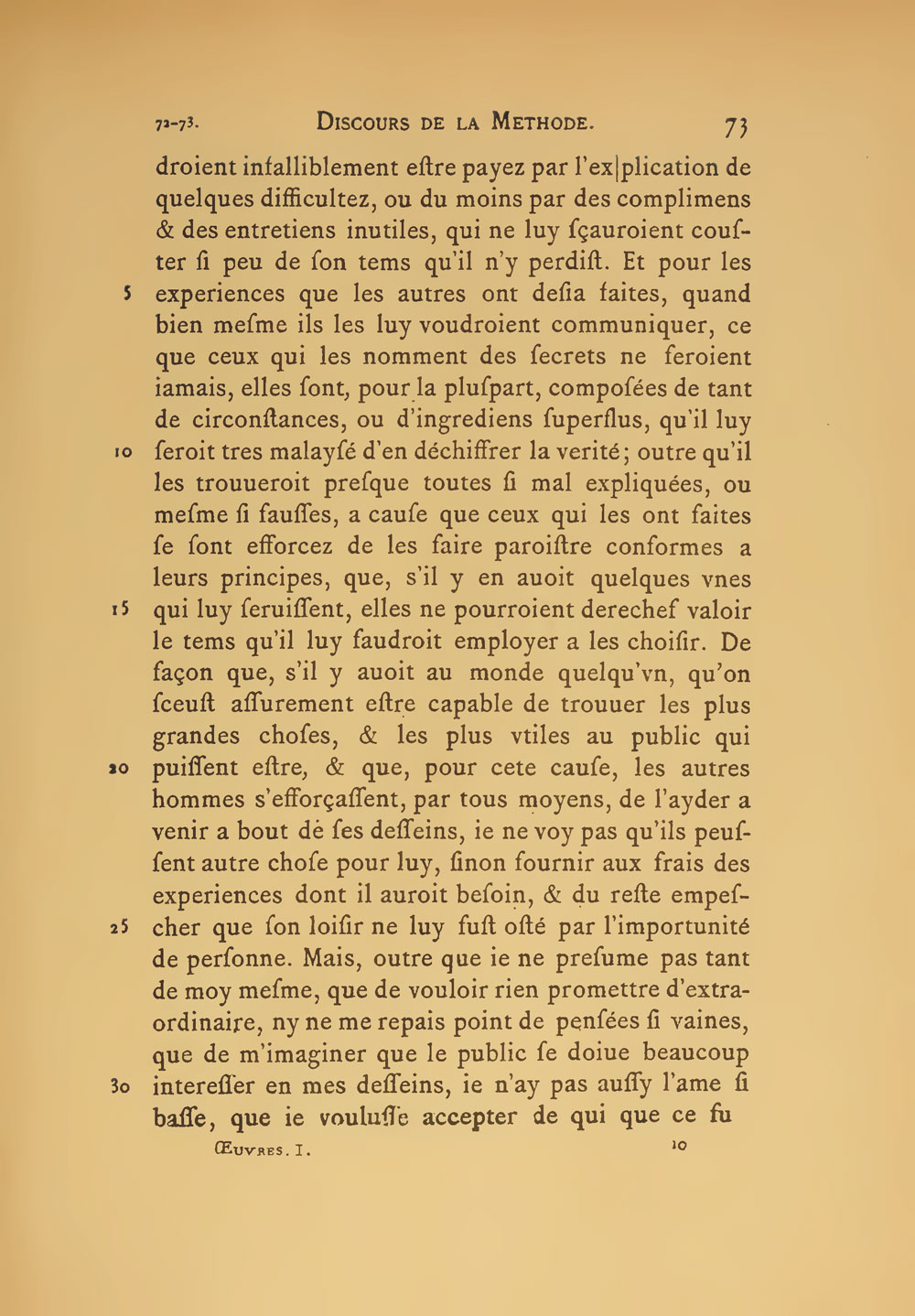 Image haute résolution sur Gallica de quelques difficultez, ou du moins par des complimens et des entretiens inutiles, qui ne luy sçauroient couster si peu de son tems qu’il n’y perdist. Et pour les experiences que les autres ont desia faites, quand bien mesme ils les luy voudroient communiquer, ce que ceux qui les nomment des secrets ne feroient iamais, elles sont pour la plus part composées de tant de circonstances, ou d’ingrediens superflus, qu’il luy seroit tres malaysé d’en déchiffrer la verité : Outre qu’il les trouueroit presque toutes si mal expliquées, ou mesme si fausses, à cause que ceux qui les ont faites se sont efforcez de les faire paroistre conformes à leurs principes, que s’il y en auoit quelques vnes qui luy seruissent, elles ne pourroient derechef valoir le tems qu’il luy faudroit employer à les choisir. De façon que s’il y auoit au monde quelqu’vn, qu’on sceust assurement estre capable de trouuer les plus grandes choses, et les plus vtiles au public qui puissent estre, et que pour cete cause les autres hommes s’efforçassent par tous moyens de l’ayder à venir à bout de ses desseins : Ie ne voy pas qu’ils peussent autre chose pour luy, sinon fournir aux frais des experiences dont il auroit besoin, et du reste empescher que son loisir ne luy fust osté par l’importunité de personne. Mais outre que ie ne presume pas tant de moymesme, que de vouloir rien promettre d’extrordinaire ; ny ne me repais point de pensées si vaines, que de m’imaginer que le public se doiue beaucoup interesser en mes desseins : Ie n’ay pas aussy l’ame si basse, que ie voulusse accepter de qui que ce fust AT VI, 74