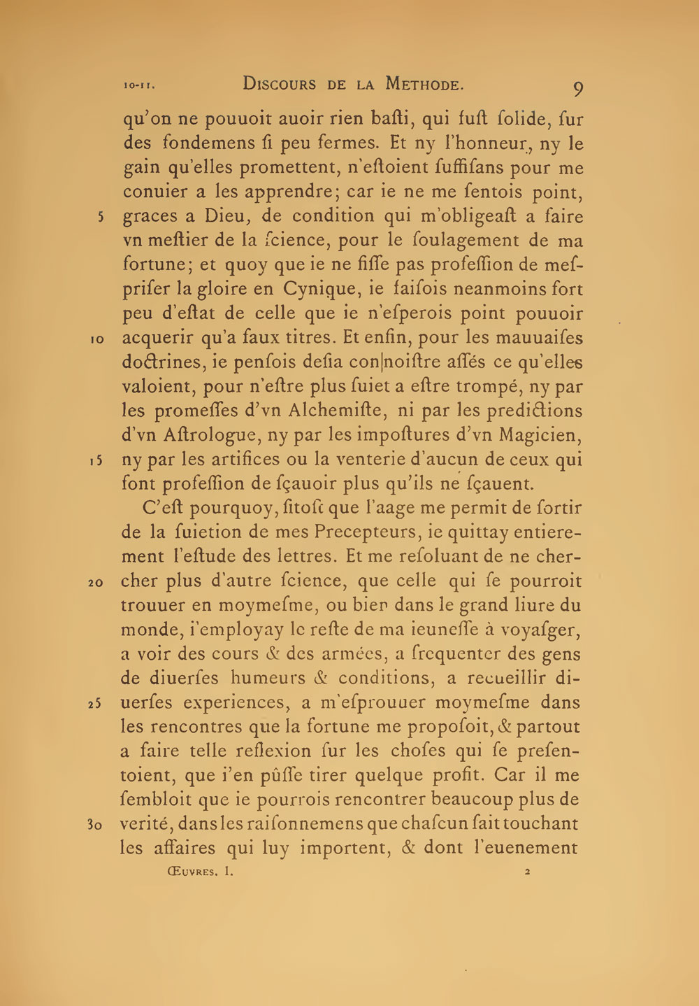 C’est pourquoy sitost que l’aage me permit de sortir de la suietion de mes Precepteurs, ie quittay entierement l’estude des lettres. Et me resoluant de ne chercher plus d’autre science, que celle qui se pourroit trouuer en moymesme, ou bien dans le grand liure du monde, I’employay le reste de ma ieunesse à voyager, à voir des cours, et des armées, à frequenter des gens de diuerses humeurs et conditions, à receuillir diuerses experiences, à m’ésprouuer moymesme dans les rencontres que la fortune me proposoit, et partout à faire telle reflexion sur les choses qui se presentoient que i’en pusse tirer quelque profit. Car il me sembloit que ie pourrois rencontrer beaucoup plus de verité dans les raisonnemens que chascun fait, touchant les affaires qui luy importent, et dont l’euenement AT VI, 10