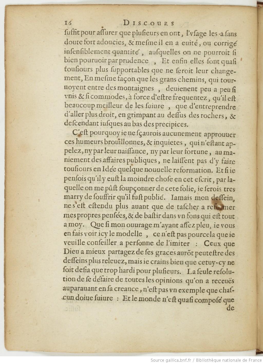 Image haute résolution sur Gallica au sens commun, quelles sembleront moins extrordinaires, et moins estranges, qu’aucunes autres qu’on puisse auoir sur mesmes suiets. Et ie ne me vante point aussy d’estre le premier Inuenteur d’aucunes, mais bien que ie ne les ay iamais receuës, ny pource qu’elles auoiẽt esté dites par d’autres, ny pourcequ’elles ne l’auoiẽt point esté, mais seulemẽt pourceq; la raisõ me les a persuadées.
