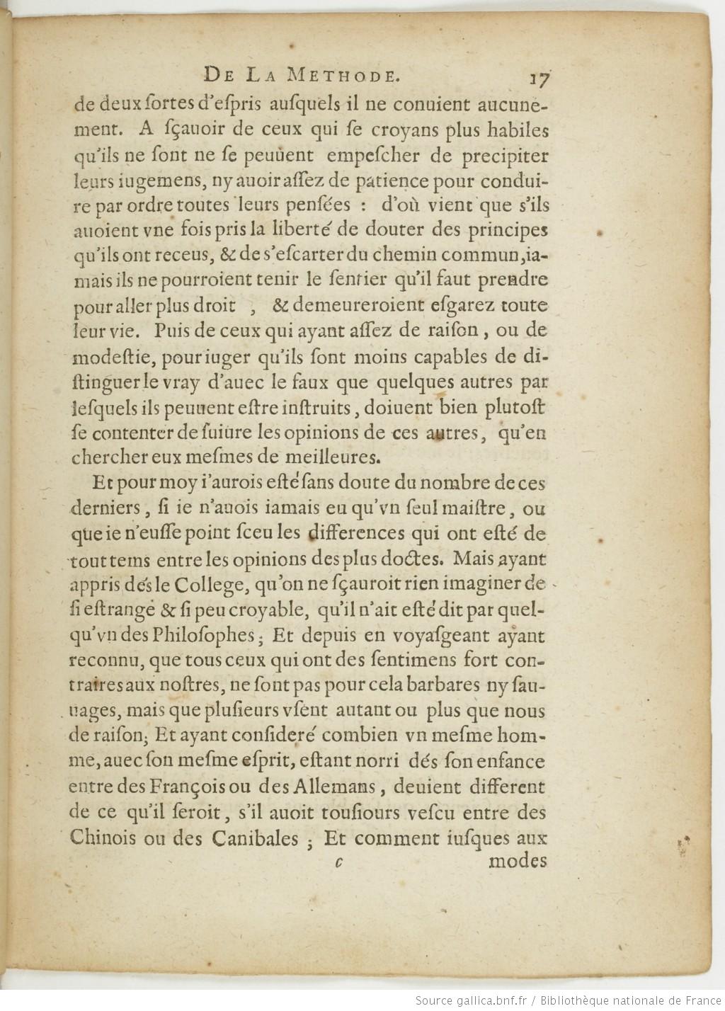 Et pour moy i’aurois esté sans doute du nombre de ces derniers, si ie n’auois iamais eu qu’vn seul maistre, ou que ie n’eusse point sceu les differences qui ont esté de tout tems entre les opinions des plus doctes. Mais ayant appris dés le College, qu’on ne sçauroit rien imaginer de si estrange et si peu croyable, qu’il n’ait esté dit par quelqu’vn des Philosophes ; Et depuis en voyasgeant ayant reconnu, que tous ceux qui ont des sentimens fort contraires aux nostres, ne sont pas pour cela barbares ny sauuages, mais que plusieurs vsent autant ou plus que nous de raison ; Et ayant consideré combien vn mesme homme, auec son mesme esprit, estant norri dés son enfance entre des François ou des Allemans, deuient different de ce qu’il seroit, s’il auoit tousiours vescu entre des Chinois ou des Canibales ; Et comment iusques aux Maire, p. 18![]()