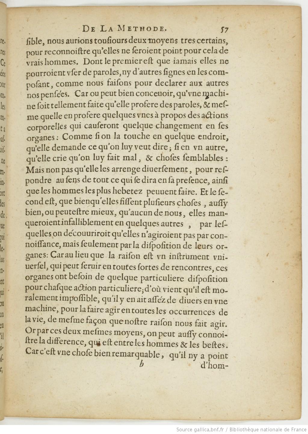 Image haute résolution sur Gallica nous aurions tousiours deux moyens tres certains, pour reconnoistre qu’elles ne seroient point pour cela de vrais hommes. Dont le premier est que iamais elles ne pourroient vser de paroles, ny d’autres signes en les composant, comme nous faisons pour declarer aux autres nos pensées. Car o