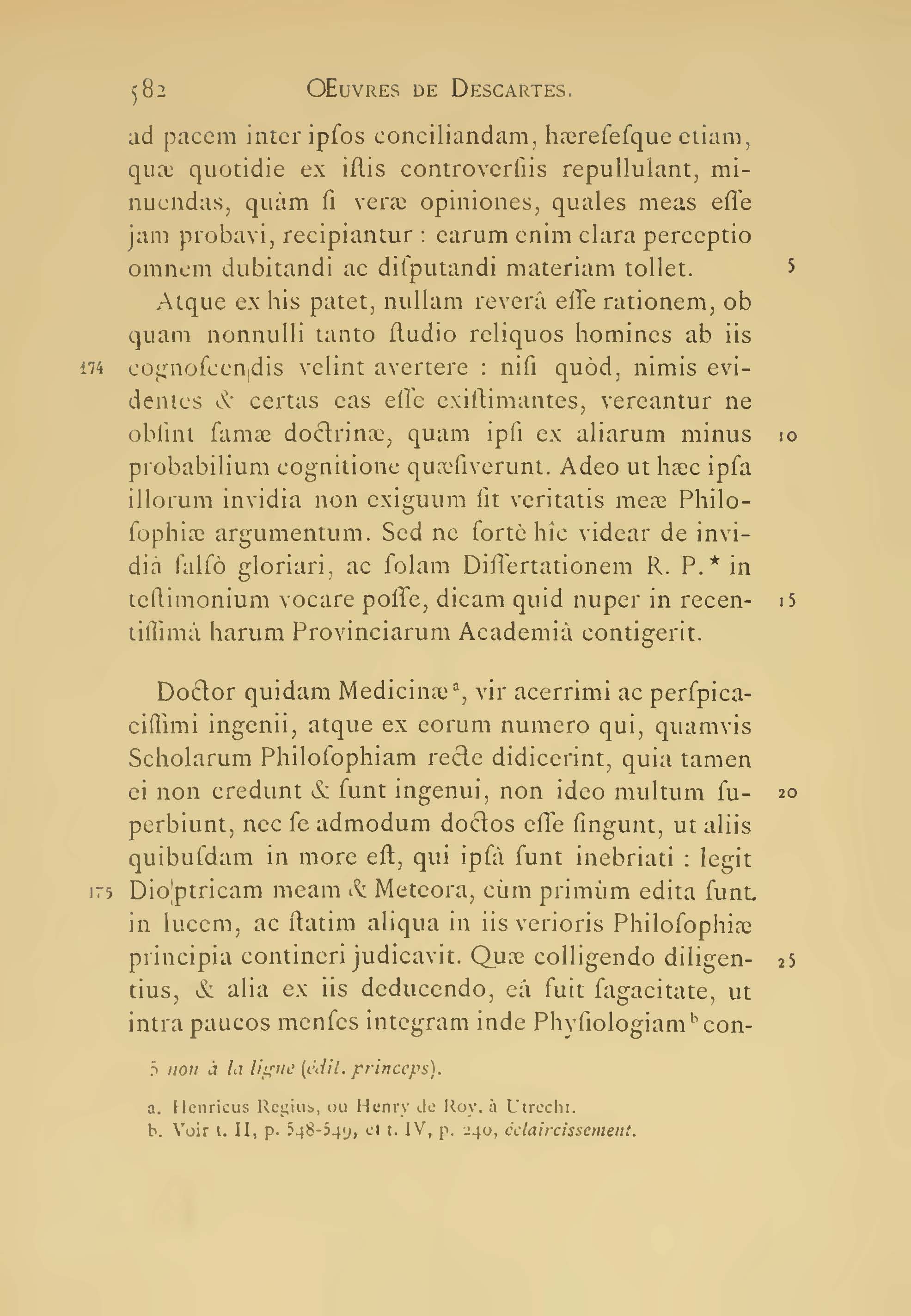 Est autem notatu dignum, hoc judicium editum fuisse, cum jam aliquandiu risissent homines, quod Rector librum Medici supprimi maluisset, quam ad ipsum respondere ; nec proinde esse dubitandum, quin omnes rationes, saltem eae quae ab illo potuerunt excogitari ad istud factum excusandum, hic expressae sint. Eas ergo, si placet, percurramus. Primo dicitur libellum Medici spectare ad detrimentum et ignominiam Academiae, ac etiam ad sinistras opiniones in aliorum animis excitandas : quod non aliter possum interpretari, quàm quod hac occasione homines sint AT VII, 594