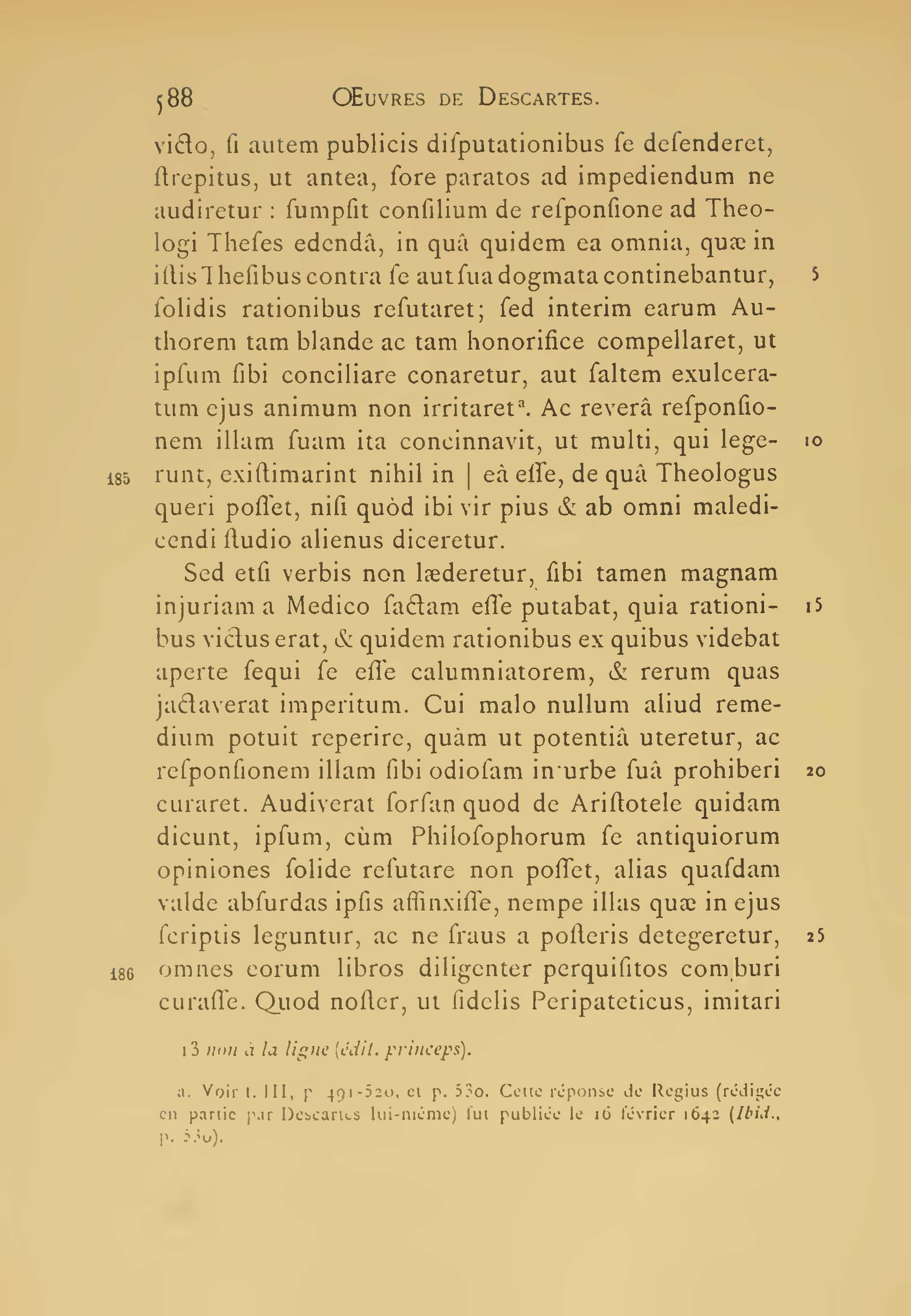 edita citarit, eumque ita designarit, ut nemo posset dubitare quin ille esset quem impugnabat. Medicus autem ei tam modeste respondit, ac nomen ejus tot elogiis ornavit, ut non contra ipsum, sed amice potius ad ipsum scripsisse, ac eum honoris tantum nominasse, fuerit credendum : ut et revera creditum fuisset, si Theologus rationes, utcunque saltem probabiles, ad eas Medici refellendas AT VII, 595