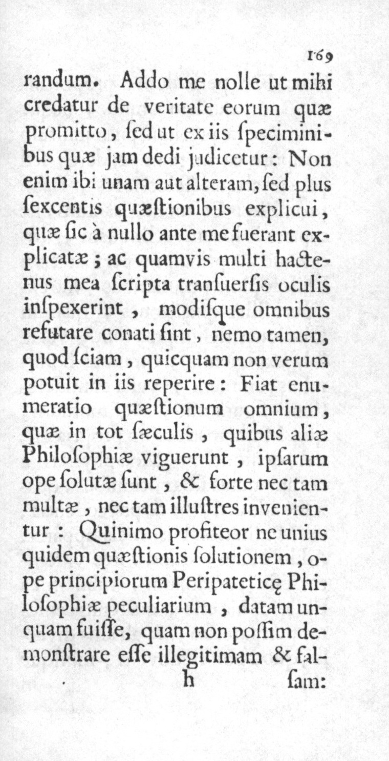 Addo me nolle ut mihi credatur de veritate eorum quae promitto, sed ut ex iis Speciminibus quae jam dedi judicetur. Non enim ibi unam aut alteram, sed plus sexcentis quaestionibus explicui, quae sic à nullo ante me fuerant explicatae ; ac quamvis multi hactenus mea scripta transversis oculis inspexerint, modisque omnibus refutare conati sint, nemo tamen, quod sciam, quicquam non verum potuit in iis reperire. Fiat enumeratio quaestionum omnium, quae in tot saeculis, quibus aliae Philosophiae viguerunt, ipsarum ope solutae sunt, et forte nec tam multae, nec tam illustres invenientur. Quinimo profiteor ne unius quidem quaestionis AT VII, 580