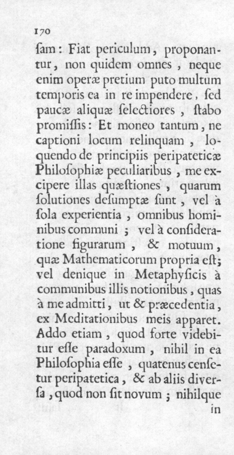 Fiat periculum, proponantur, non quidem omnes, neque enim operae pretium puto multum temporis ea in re impendere, sed paucae aliquae selectiores : stabo promissis. et moneo tantum, ne captioni locum relinquam, loquendo de principiis Peripateticae Philosophiae peculiaribus, me excipere illas quaestiones, quarum solutiones desumptae sunt vel a sola experientia omnibus hominibus communi, vel à consideratione figurarum et motuum quae Mathematicorum propria est, vel denique in Metaphysicis à communibus illis notionibus quas à me admitti, ut et praecedentia, ex Meditationibus meis apparet. Addo etiam, quod forte videbitur esse paradoxum, nihil in ea Philosophia esse, quatenus censetur Peripatetica, et ab aliis diversa, quod non sit novum ; nihilque Elzevier, p. 171
