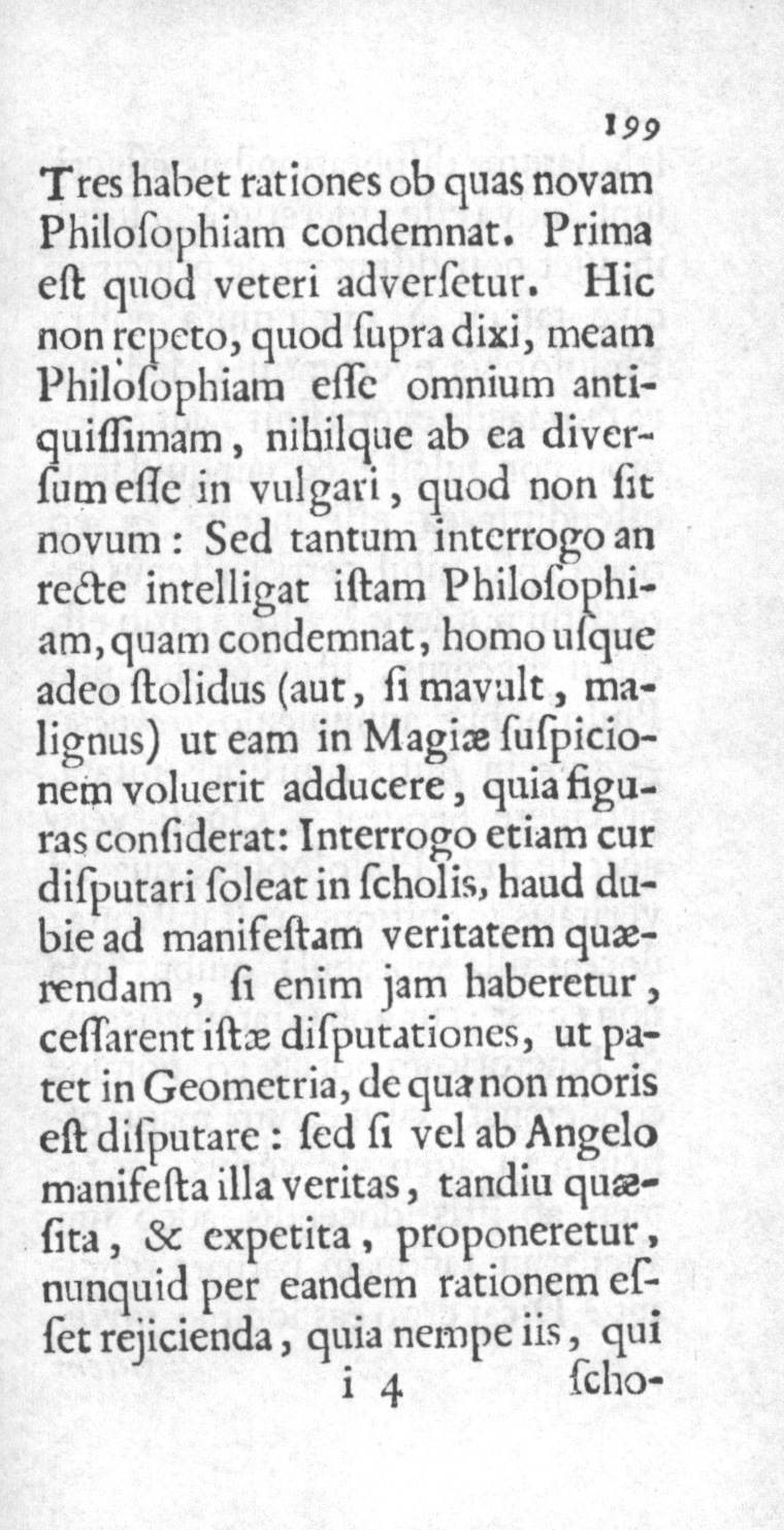 Tres habet rationes ob quas novam Philosophiam condemnat. Prima est quod veteri adversetur. Hic non repeto quod supra dixi, meam Philosophiam esse omnium antiquissimam, nihilque ab ea diversum esse in vulgari, quod non fit novum. Sed tantum interrogo an recte intelligat istam Philosophiam quàm condemnat, homo usque adeo stolidus (aut, si mavult, malignus), ut eam in Magiae suspicionem voluerit adducere, quia figuras considerat. Interrogo etiam cur disputari soleat in scholis. Haud dubie ad manifestam veritatem quaerendam. Si enim jam haberetur, cessarent istae disputationes, ut patet in Geometria, de qua non moris est disputare. Sed si vel ab Angelo manifesta illa veritas, tandiu quaesita et expetita, proponeretur, nunquid per eandem rationem esset rejicienda, quia nempe iis, qui Elzevier, p. 200