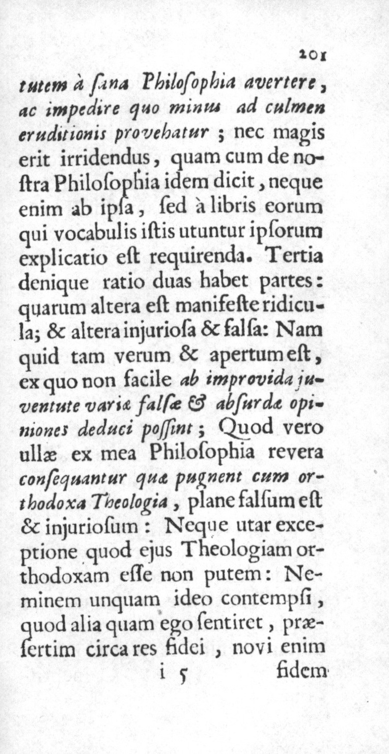 veterem et vulgarem Philosophiam optime consentire multorum annorum experientia jam docuit, de nova autem incertum est. Ideoque ne forte, imperitam multitudinem novitatis avidam ad se alliciendo, paulatim crescat et vires sumat, Scholarumque sive Academiarum pacem et quietem perturbet, vel etiam in Ecclesia novas haereses adducat, mature prohibendam atque extinguendam esse quidam contendunt. Ego vero contra respondeo, me quidem mihi nihil arrogare, nec profiteri me plus videre quàm caeteros ; sed hoc forte mihi profuisse, quod, cum proprio ingenio non multum fidam, planas tantum et faciles vias sim sequutus. Nam, si quis per ipsas magis promoveat quàm alii, multo majori ingenio praediti, per salebrosas et impenetrabiles illas quas sequuntur, non est mirandum. Elzevier, p. 169