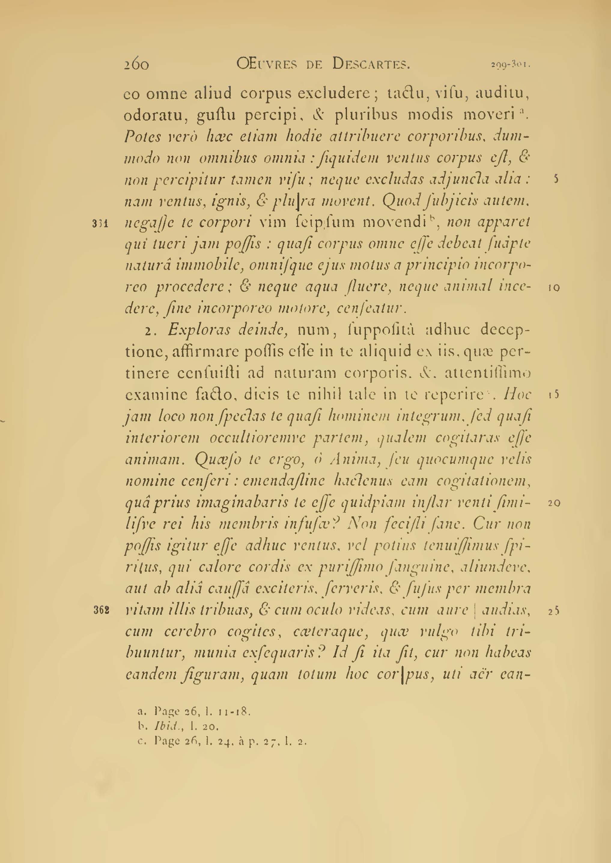 2. Exploras deinde, num, supposita adhuc deceptione, affirmare possis esse in te aliquid ex iis, quae pertinere censuisti ad naturam corporis, et, attentissimo examine facto, dicis te nihil tale in te reperire. Hoc jam loco non spectas te quasi hominem integrum, sed quasi interiorem occultioremve partem, qualem cogitaras esse animam. Quaeso te ergo, o Anima, seu quocumque velis nomine censeri : emendastine hactenus eam cogitationem, qua prius imaginabaris te esse quidpiam instar venti similisve rei his membris infusae ? Non fecisti sane. Cur non possis igitur esse adhuc ventus, vel potius tenuissimus spiritus, qui calore cordis ex purissimo sanguine, aliundeve, aut ab alia caussa exciteris, ferveris, et fusus per membra vitam illis tribuas, et cum oculo videas, cum aure audias, cum cerebro cogites, caeteraque, quae vulgo tibi tribuuntur, munia exsequaris ? Id si ita sit, cur non habeas eandem figuram, quam totum hoc corpus, Elzevier, p. 301