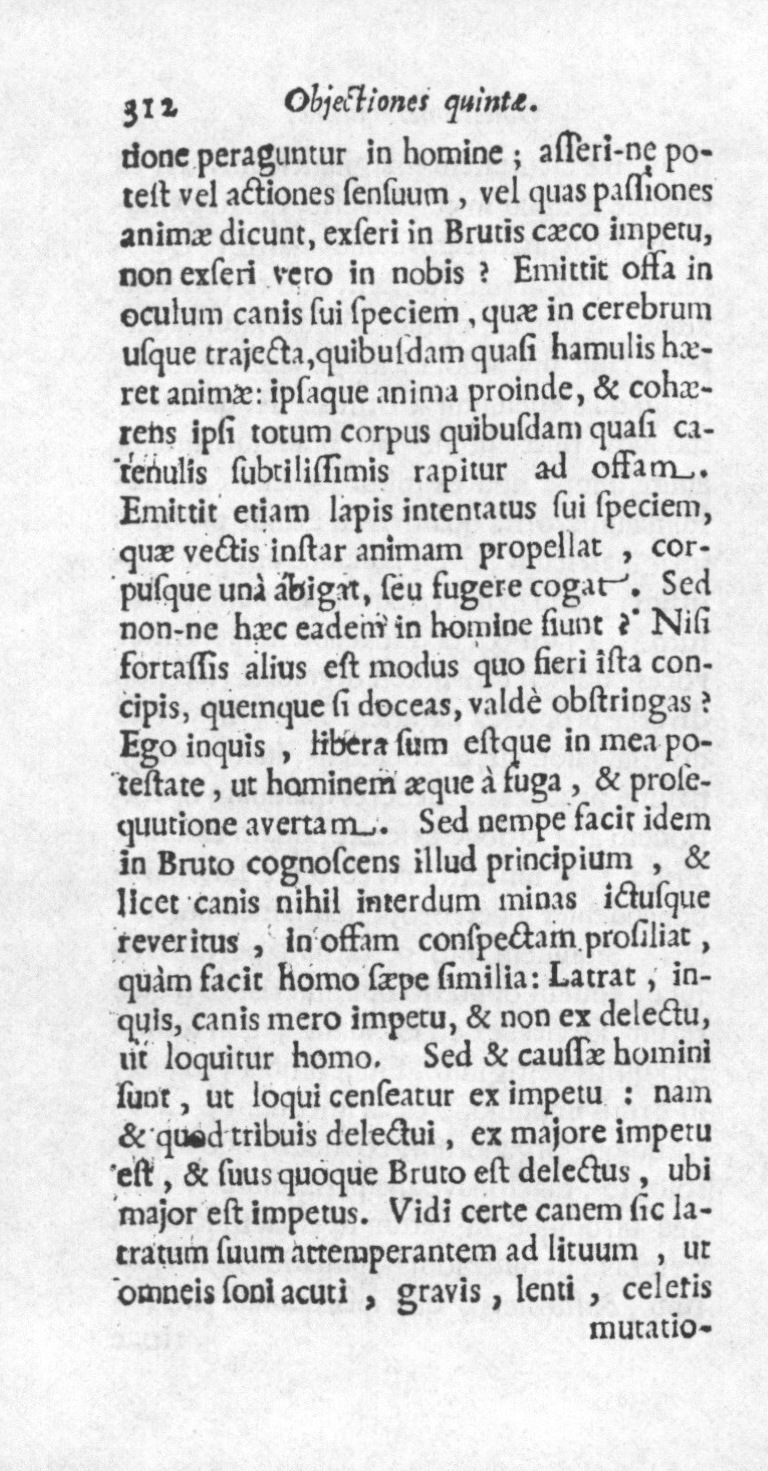peraguntur in homine ; asserine potest vel actiones sensuum, vel quas passiones animae dicunt, exseri in brutis caeco impetu, non exseri vero in nobis ? Emittit ossa in oculum canis sui speciem, quae, in cerebrum usque trajecta, quibusdam quasi hamulis haeret animae ; ipsaque anima proinde, et cohaerens ipsi totum corpus, quibusdam quasi catenulis subtilissimis rapitur ad ossam. Emittit etiam lapis intentatus sui speciem, quae vectis instar animam propellat, corpusque una abigat, seu fugere cogat. Sed nonne haec eadem in homine fiunt ? Nisi fortassis alius est modus, quo fieri ista concipis, quemque si doceas, valde obstringas. Ego, inquis, libera sum, estque in mea potestate, ut hominem aeque a fuga et prosequutione avertam. Sed nempe facit idem in bruto cognoscens illud principium ; et licet canis, nihil interdum minas ictusque reveritus, in ossam conspectam prosiliat, quam facit homo saepe similia ! Latrat, inquis, canis mero impetu, et non ex delectu, ut loquitur homo. Sed et caussae homini sunt, ut loqui censeatur ex impetu ; nam et quod tribuis delectui, ex majore impetu est, et suus quoque bruto est delectus, ubi major est impetus. Vidi certe canem sic latratum suum attemperantem ad lituum, ut omneis soni acuti, gravis, lenti, celeris Elzevier, p. 313