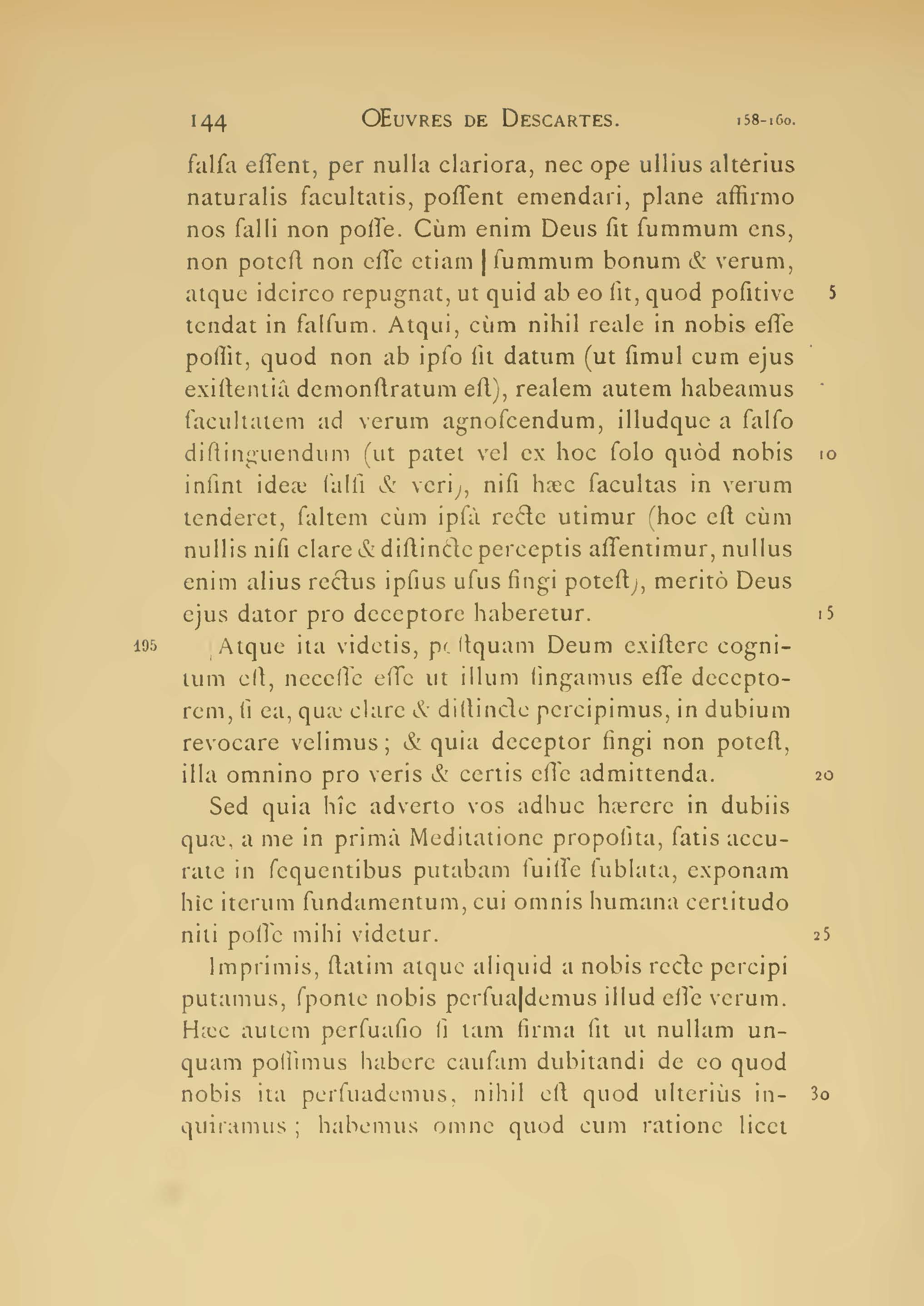 Et quidem hic distinguo inter indefinitum, et infinitum, illudque tantum proprie infinitum appello, in quo nulla ex parte limites inveniuntur ; quo sensu solus Deus est infinitus ; illa autem in quibus sub aliqua tantum ratione finem non agnosco, ut extensio spatii imaginarii, multitudo numerorum, divisibilitas partium quantitatis, et similia, indefinita quidem appello, non autem infinita, quia non omni ex parte fine carent. Praeterea distinguo inter rationem formalem infiniti, sive infinitatem, et rem quae est infinita ; nam quantum ad infinitatem, etiamsi illam intelligamus esse quam maxime Elzevier, p. 122