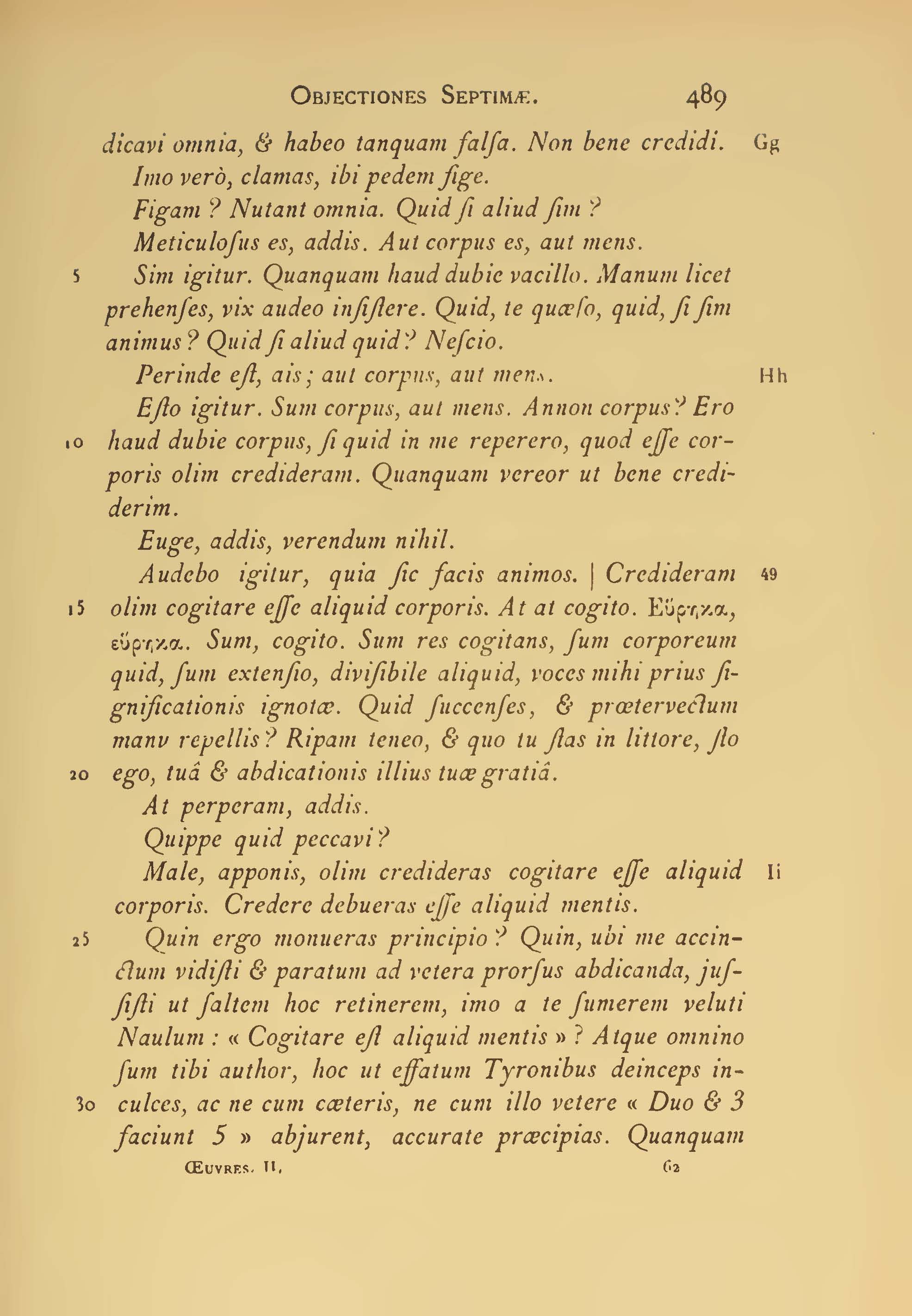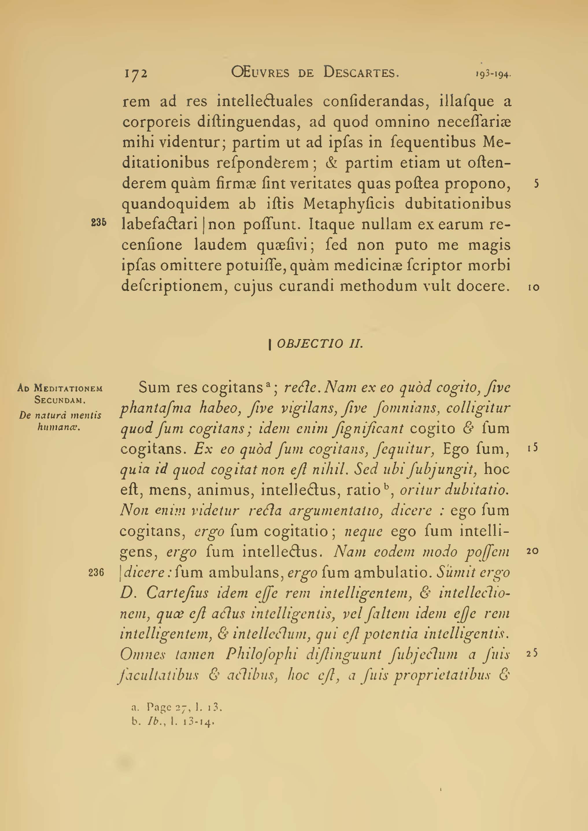 Ut vidi vos omnino istius animi esse, ut scripta Domini Cartesii penitius inspiciam, non debui hac in causa viris mihi undequaque amicissimis non obtemperare ; tum ut hoc ipso videatis quanti vos aestimem, tum etiam ut constet quantum et viribus meis, et ingenio desit, ut in posterum et ametis plusculum, si indigeo, et minus oneri sitis, si non sufficio. Est sane D. Cartesius quantum animadverto vir ingenii maximi, summaeque modestiae, quales vel ipse Momus amet, si adsit. Cogito, inquit, ergo sum ; imo ipsa cogitatio, aut mens sum ita : atqui cogitando, ideas rerum AT VII, 92