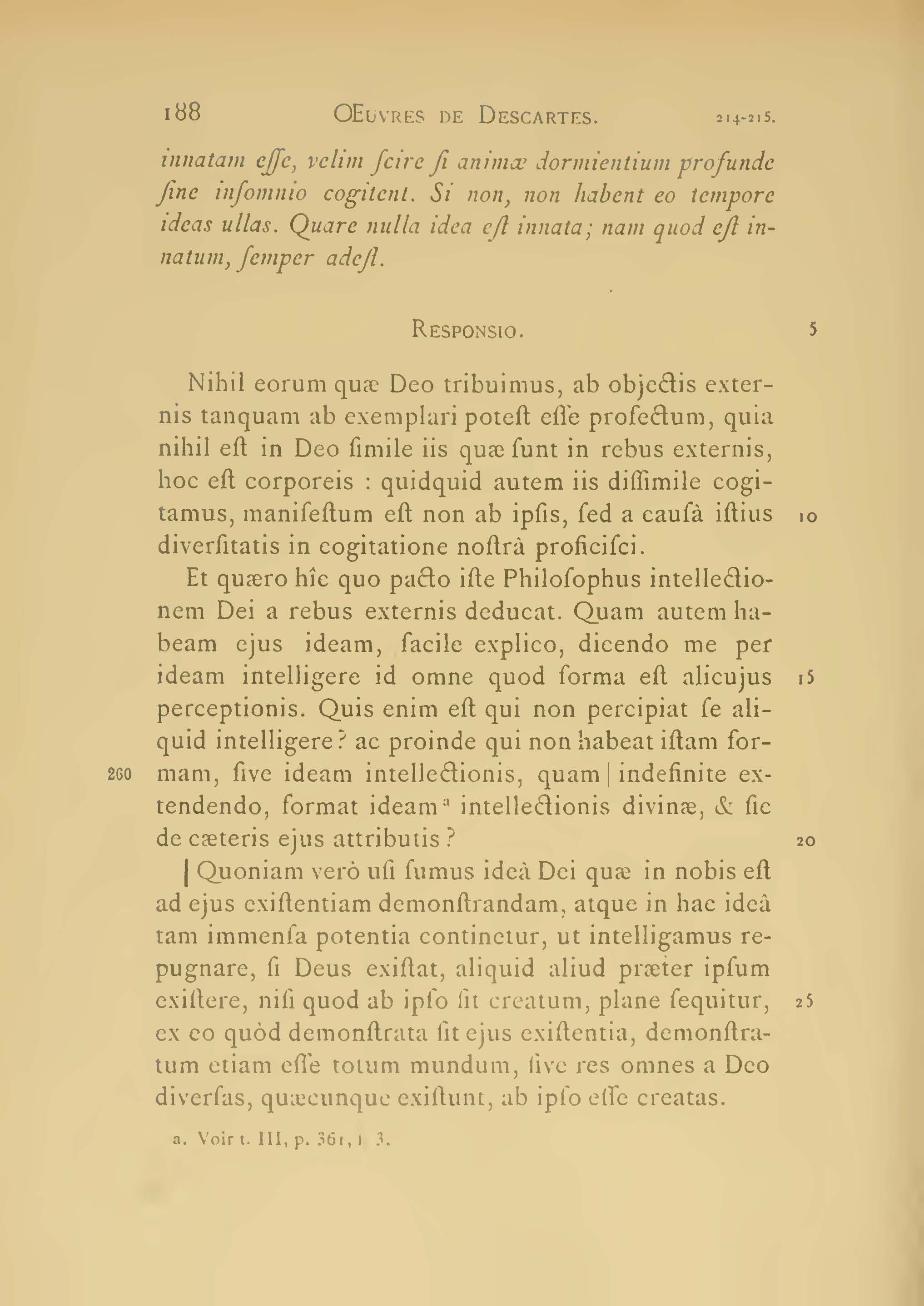 compositi est, Leo existens. Et tamen distincta cognitio Dei, distincta, inquam, cognitio Dei ab aeterno non necessario urget alterutram partem hujus compositi esse, nisi supponas ipsum compositum esse : tunc enim essentiales suas perfectiones omnes, ac proinde etiam actualem existentiam involvet. Ita quoque, etiamsi distincte cognoscam ens summum ; et licet ens summe perfectum in conceptu suo essentiali existentiam includat, non tamen sequitur existentiam modo actu quid esse, nisi supponas ens illud summum esse, tunc enim ut omnes sui perfectiones, ita etiam hanc existentiam actu includet. Elzevier, p. 107