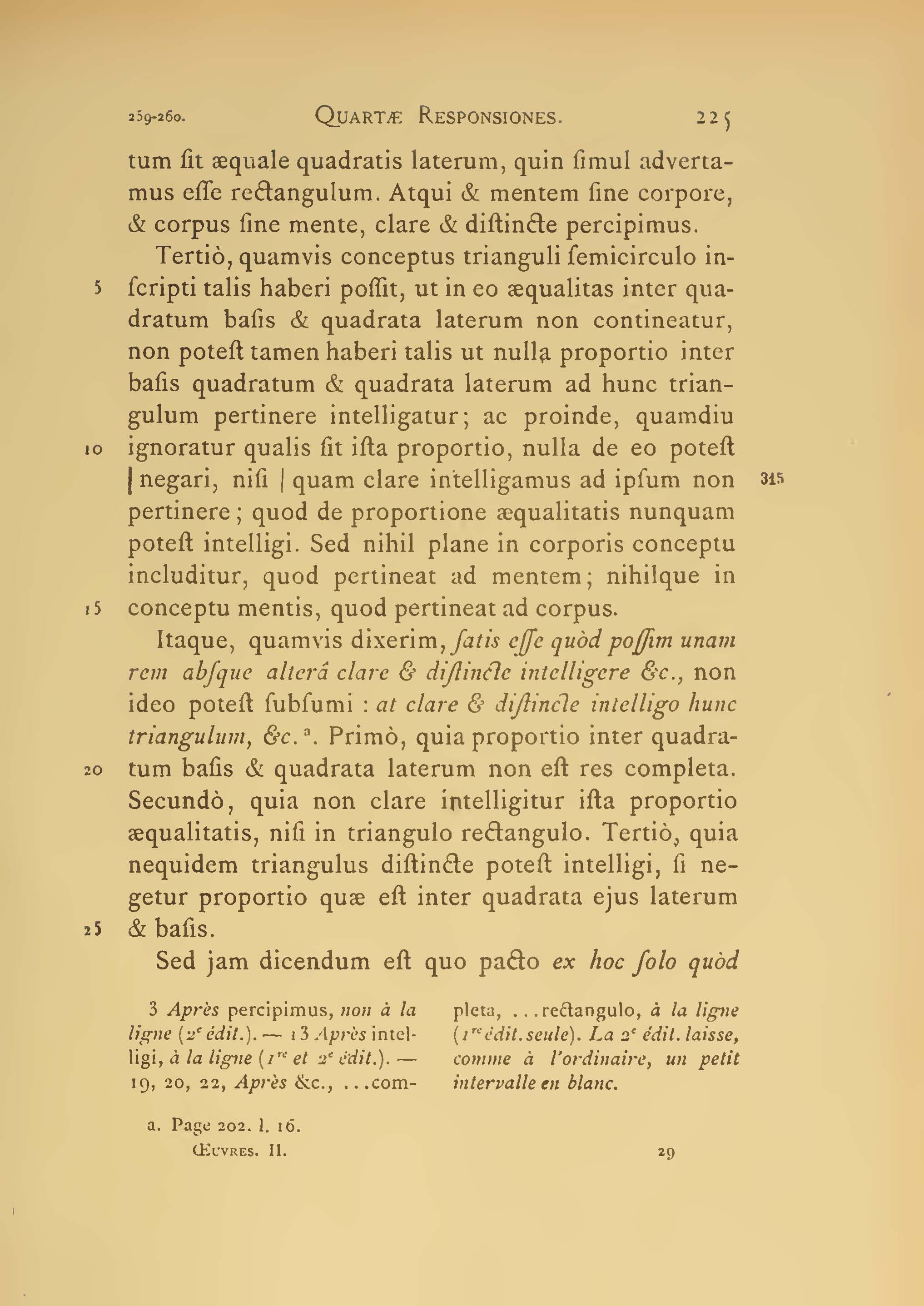 eam curam demandes : ac quemadmodum in forensibus judiciis, cum duo vel tres testes fide digni aliquid se vidisse affirmant, plus iis solis fidei habetur, quàm universae aliorum hominum multitudini, quae forte conjecturis adducta contrarium putat : ita illis dumtaxat credas qui rem, de qua judicabunt, perfecte se intelligere profitebuntur ; ac demum ut, si quas habueris rationes quae me ab instituto meo debeant revocare, ipsas me docere non graveris. Etenim, in paucis illis Meditationibus quas edidi, principia omnia Philosophiae quàm paro continentur ; in Dioptrica autem et Meteoris, particularia multa ex iis deduxi, quae declarant quo ratiocinandi genere utar ; ideoque, quamvis istam Philosophiam nondum totam ostendam, existimo tamen, ex iis quae jam dedi, facile posse intelligi qualis sit futura. Elzevier, p. 211