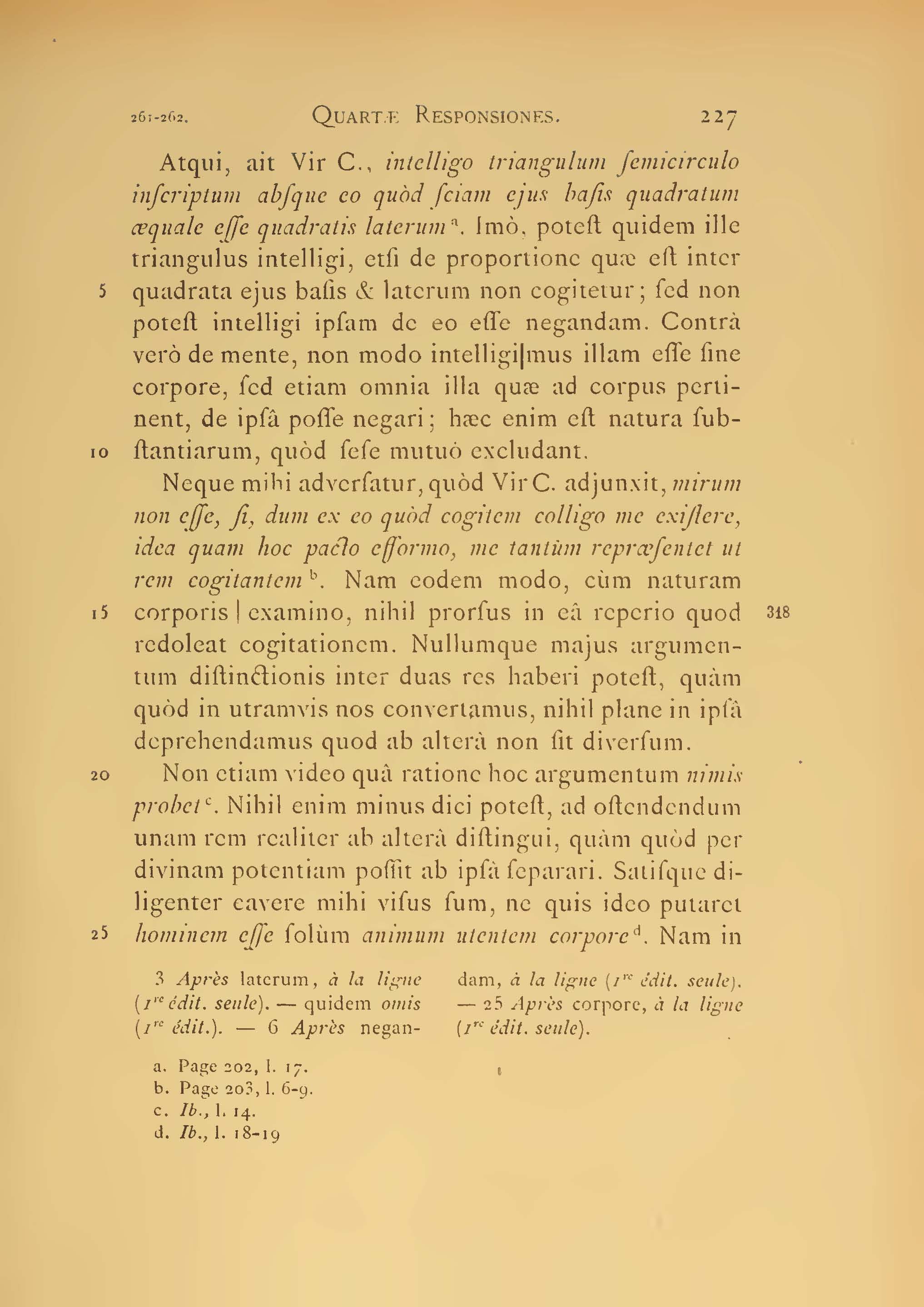 Ac in primis, etsi modo authoritate non agimus, sed ratione tantum ; tamen ne ex libidine maximo ingenio videar reluctari, ipsum potius S. Thomam audite ; objicit sibi ; intellecto quid significet hoc nomen Deus, statim habetur quod Deus est, significatur enim hoc nomine id quo majus significari non potest : majus autem est quod est in re et in intellectu, quam quod est in intellectu tantum : unde cum intellecto hoc nomine Deus statim sit in intellectu, sequitur etiam quod sit in re : quod argumentum in forma ita reddo. Deus est quo majus significari non potest, sed illud quo majus significari non potest includit existentiam, ergo Deus ipso nomine, vel conceptu suo includit existentiam, ac proinde sine existentia nec concipi, nec esse potest. nunc, amabo vos, nunquid ipsum hoc argumentum est D. Cartesii ? S. Thomas Deum ita definit ; quo majus significari non potest : D. C. vocat eum Ens summe perfectum, illo sane majus significari non potest. S. Thomas subsumit : id quo majus significari non potest, includit existentiam ; alioqui eo majus aliquid significari potest, nempe id quod etiam existentiam significatur includere. At nunquid D. C. idem subsumere videtur ? Elzevier, p. 105