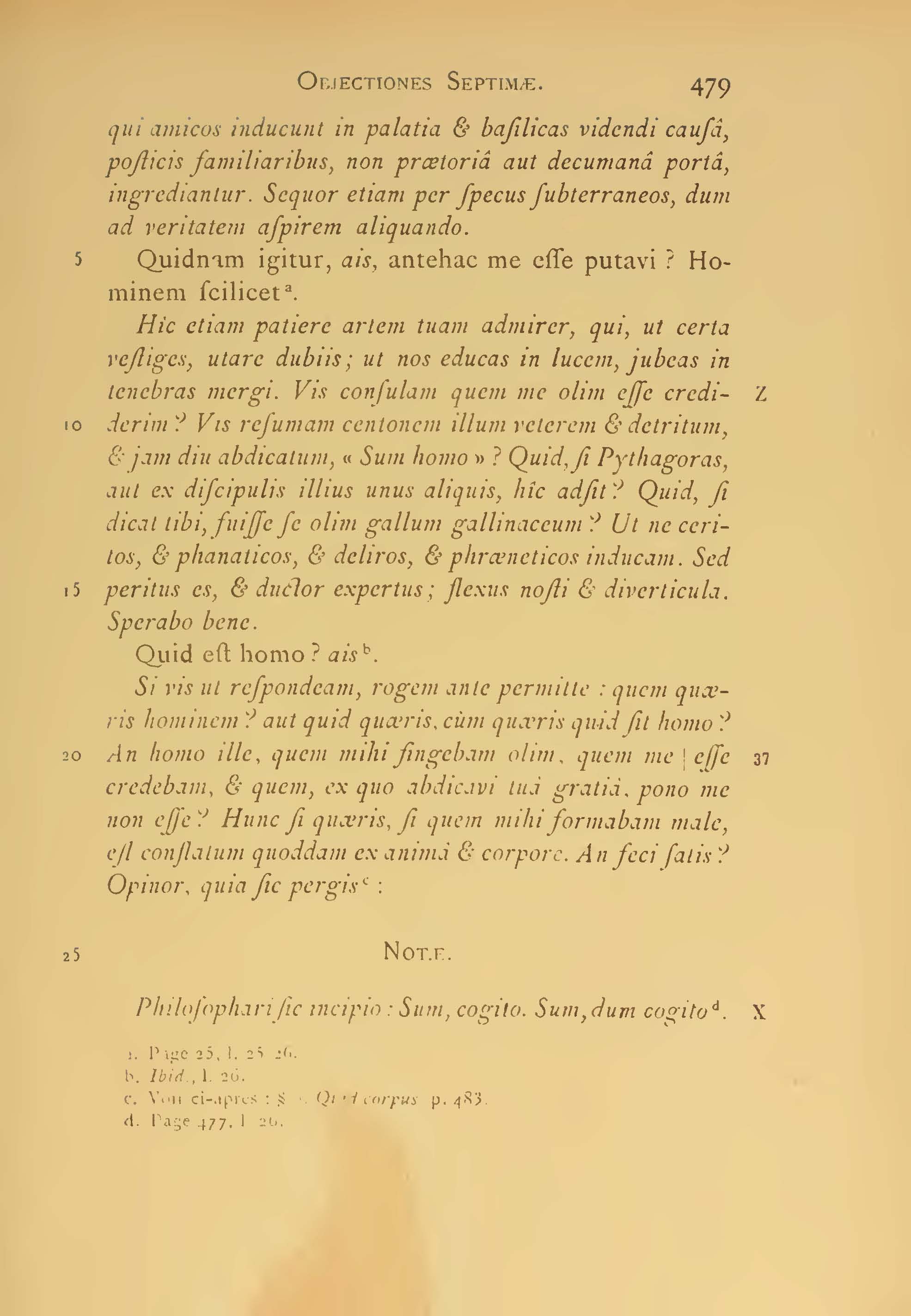 intellectum meum, qui est finitus, non capere infinitum. Itaque malui uti pro fundamento meae rationis existentia meiipsius, quae a nulla causarum serie dependet, mihique tam nota est ut nihil notius esse possit : et de me non tam quaesivi a qua causa olim essem productus, quam a qua tempore praesenti conserver, ut ita me ab omni causarum Elzevier, p. 115