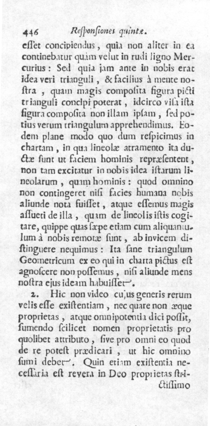 machinae tale artificium objectivum contineat potius quam aliud, hoc profectohabere debet ab aliqua causa ; estque idem respectu hujus artificium objectivum, quod respectu ideae Dei realitas objectiva. Et quidem hujus artificii causa varia potest assignari, vel enim est realis aliqua talis machina prius visa, ad cujus similitudinem idea ista formata est, vel magna Mechanicae scientia quae est in illo intellectu, vel forte magna ingenii subtilitas, cujus ope etiam sine praevia scientia potuit illam invenire. Notandumque omne artificium quod in idea illa est tantum objective, necessario esse debere in ejus causa, qualiscunque tandem illa sit, vel formaliter, vel eminenter. Et idem etiam de realitate objectiva quae est in idea Dei, esse putandum. In quonam vero haec ita erit nisi in Deo realiter existente ? Sed vidit optime haec omnia vir perspicax, ideoque fatetur peti posse cur haec idea hanc realitatem objectivam potius contineat quam illam, eique quaestioni respondit primo de ideis omnibus idem esse quod scripsi de idea trianguli, nempe etsi forte triangulum nullibi gentium existat, esse tamen ejus determinatam Elzevier, p. 112