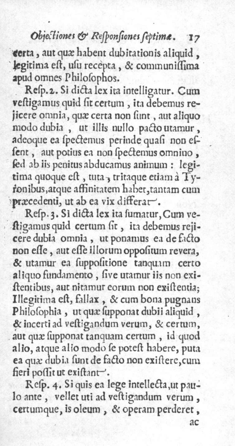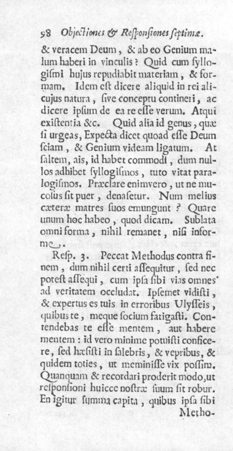 Tres habet rationes ob quas novam Philosophiam condemnat. Prima est quod veteri adversetur. Hic non repeto quod supra dixi, meam Philosophiam esse omnium antiquissimam, nihilque ab ea diversum esse in vulgari, quod non fit novum. Sed tantum interrogo an recte intelligat istam Philosophiam quàm condemnat, homo usque adeo stolidus (aut, si mavult, malignus), ut eam in Magiae suspicionem voluerit adducere, quia figuras considerat. Interrogo etiam cur disputari soleat in scholis. Haud dubie ad manifestam veritatem quaerendam. Si enim jam haberetur, cessarent istae disputationes, ut patet in Geometria, de qua non moris est disputare. Sed si vel ab Angelo manifesta illa veritas, tandiu quaesita et expetita, proponeretur, nunquid per eandem rationem esset rejicienda, quia nempe iis, qui Elzevier, p. 200