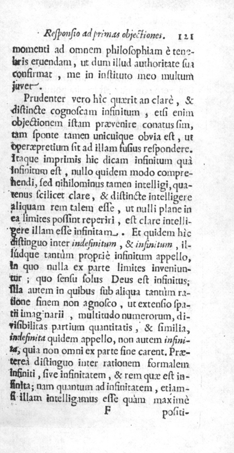 Et quidem hic distinguo inter indefinitum, et infinitum, illudque tantum proprie infinitum appello, in quo nulla ex parte limites inveniuntur ; quo sensu solus Deus est infinitus ; illa autem in quibus sub aliqua tantum ratione finem non agnosco, ut extensio spatii imaginarii, multitudo numerorum, divisibilitas partium quantitatis, et similia, indefinita quidem appello, non autem infinita, quia non omni ex parte fine carent. Praeterea distinguo inter rationem formalem infiniti, sive infinitatem, et rem quae est infinita ; nam quantum ad infinitatem, etiamsi illam intelligamus esse quam maxime Elzevier, p. 122