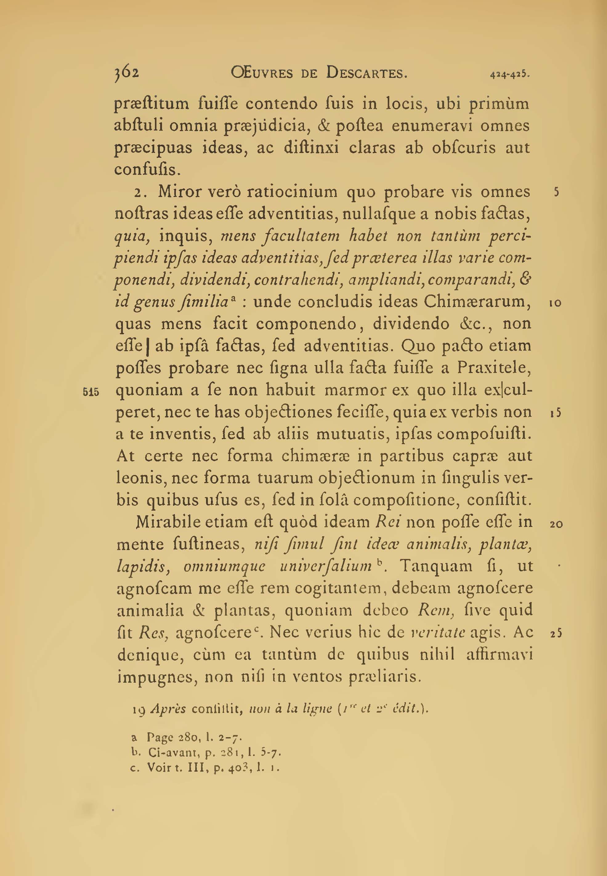 2. Miror vero ratiocinium quo probare vis omnes nostras ideas esse adventitias, nullasque a nobis factas, quia, inquis, mens facultatem habet non tantum percipiendi ipsas ideas adventitias, sed praeterea illas varie componendi, dividendi, contrahendi, ampliandi, comparandi, et id genus similia : unde concludis ideas Chimaerarum, quas mens facit componendo, dividendo etc., non esse Elzevier, p. 425