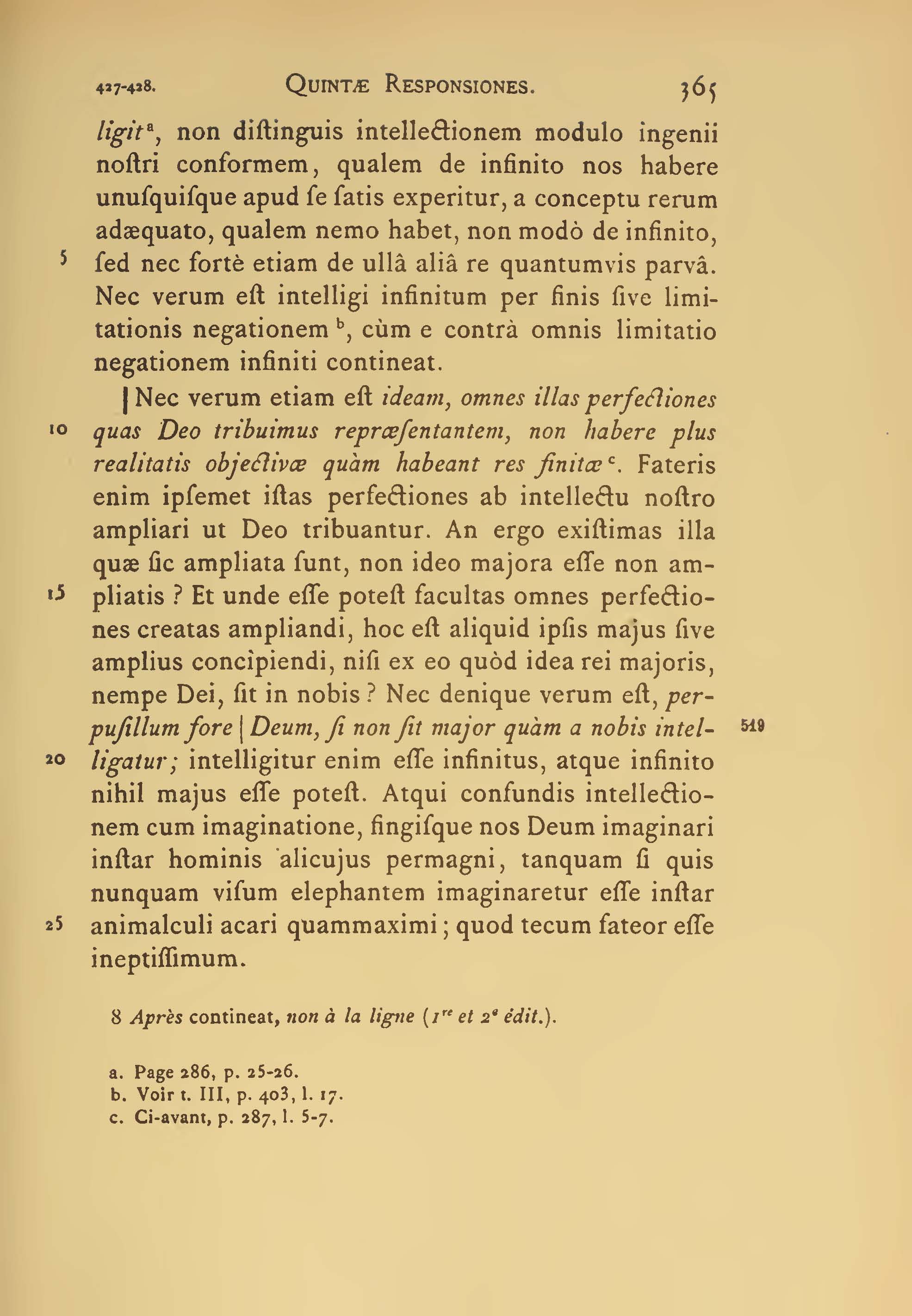Non distinguis intellectionem modulo ingenii nostri conformem, qualem de infinito nos habere unusquisque apud se satis experitur, a conceptu rerum adaequato, qualem nemo habet, non modo de infinito, sed nec forte etiam de ulla alia re quantumvis parva. Nec verum est intelligi infinitum per finis sive limitationis negationem, cum e contra omnis limitatio negationem infiniti contineat. Elzevier, p. 428