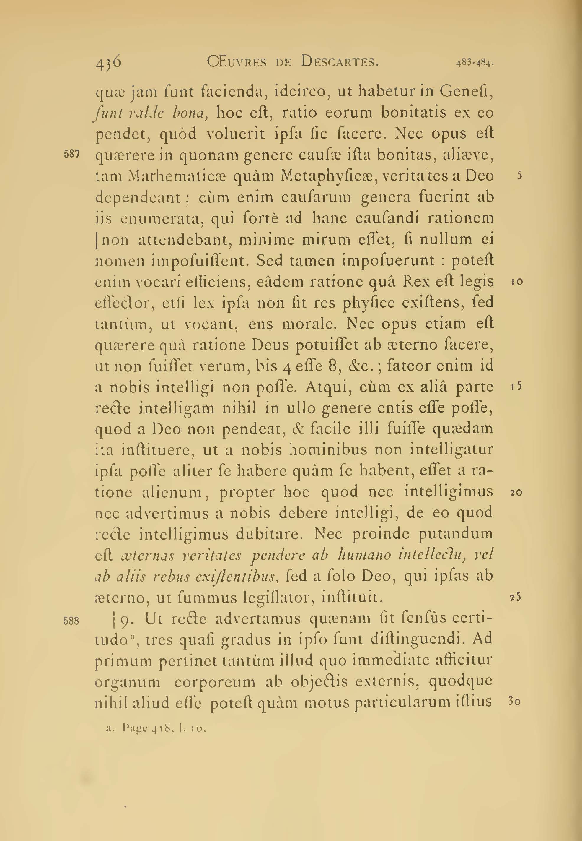 quae jam sunt facienda, idcirco, ut habetur in Genesi, sunt valde bona, hoc est, ratio eorum bonitatis ex eo pendet, quod voluerit ipsa sic facere. Nec opus est quaerere in quonam genere causae ista bonitas, aliaeve, tam Mathematicae quam Metaphysicae, veritates a Deo dependeant ; cum enim causarum genera fuerint ab iis enumerata, qui forte ad hanc causandi rationem Elzevier, p. 484
