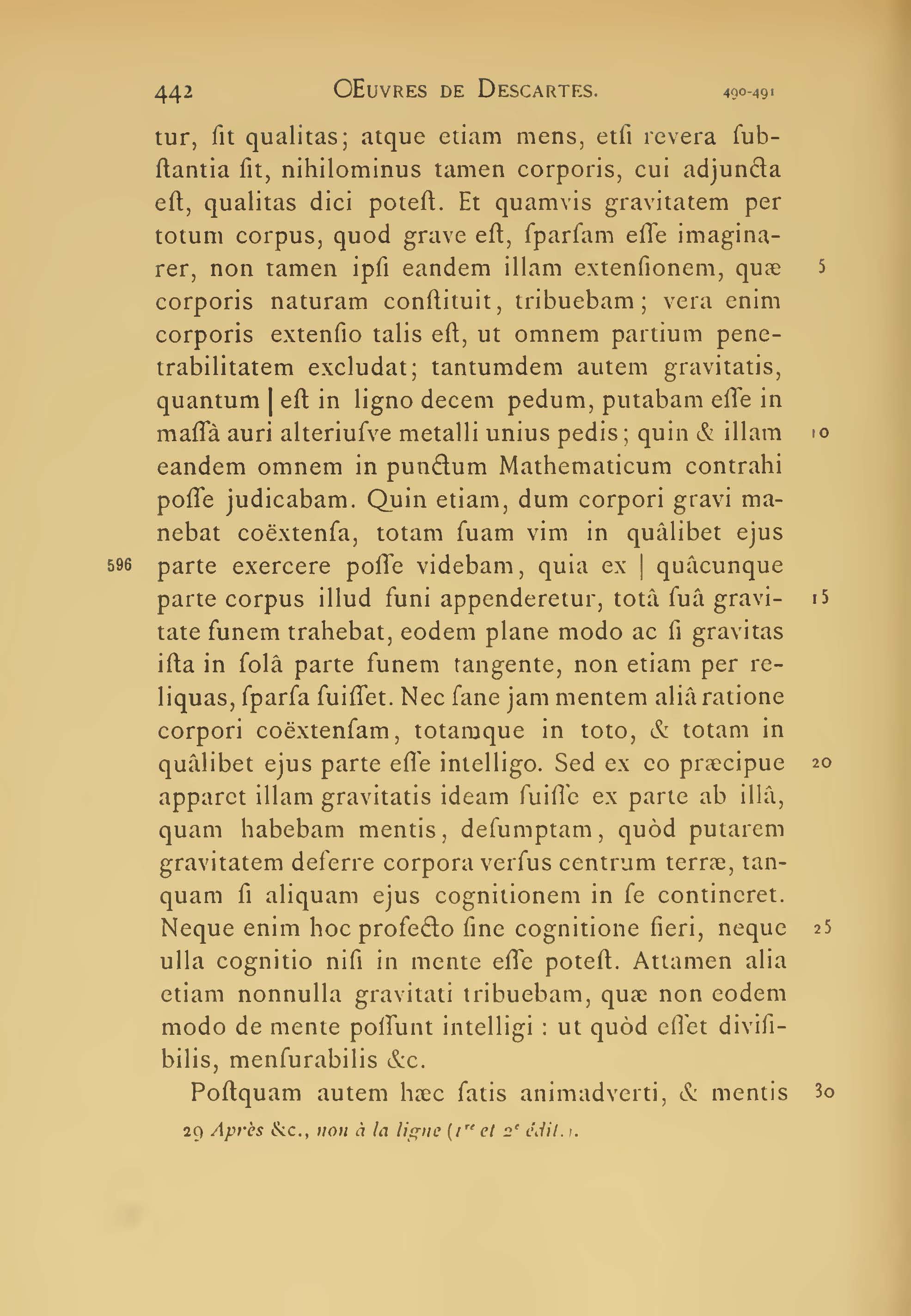 est in ligno decem pedum, putabam esse in massa auri alteriusve metalli unius pedis ; quin et illam eandem omnem in punctum Mathematicum contrahi posse judicabam. Quin etiam, dum corpori gravi manebat coëxtensa, totam suam vim in qualibet ejus parte exercere posse videbam, quia ex quacunque parte corpus illud funi appenderetur, tota sua gravitate funem trahebat, eodem plane modo ac si gravitas ista in sola parte funem tangente, non etiam per reliquas, sparsa fuisset. Nec sane jam mentem alia ratione corpori coëxtensam, totamque in toto, et totam in qualibet ejus parte esse intelligo. Sed ex eo praecipue apparet illam gravitatis ideam fuisse ex parte ab illa, quam habebam mentis, desumptam, quod putarem gravitatem deferre corpora versus centrum terrae, tanquam si aliquam ejus cognitionem in se contineret. Neque enim hoc profecto sine cognitione fieri, neque ulla cognitio nisi in mente esse potest. Attamen alia etiam nonnulla gravitati tribuebam, quae non eodem modo de mente possunt intelligi : ut quod esset divisibilis, mensurabilis, etc. Postquam autem haec satis animadverti, et mentis AT VII, 443