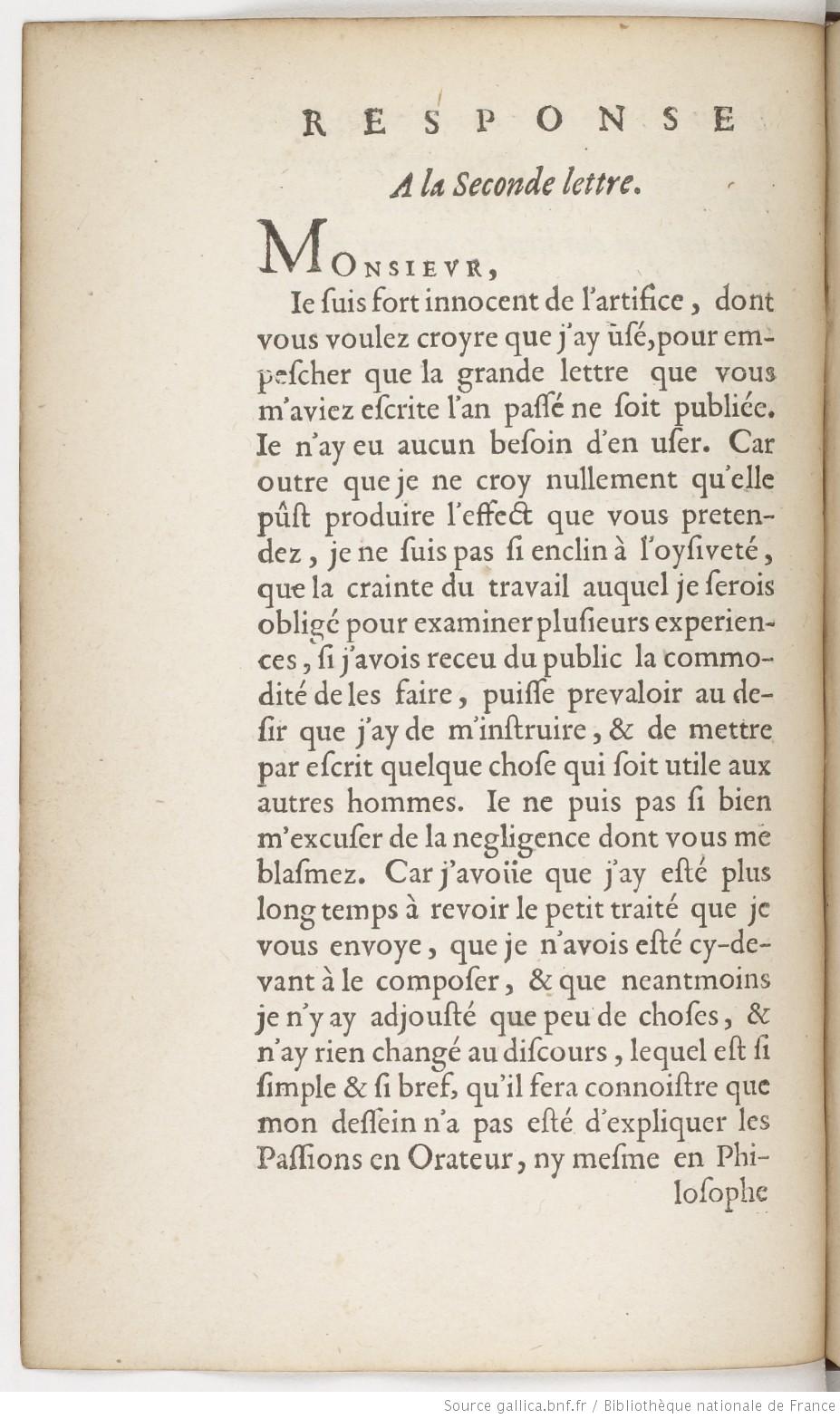 Image haute résolution sur Gallica moral, mais seulement en Physicien. Ainsi je prevoy que ce traité n’aura pas meilleure fortune que mes autres escrits ; et bien que son titre convie peut estre davantage de personnes à le lire, il n’y aura neantmoins que ceux qui prendront la peine de l’examiner avez soin, ausquels il puisse satisfaire. Tel qu’il est, je le mets entre vos mains, etc.