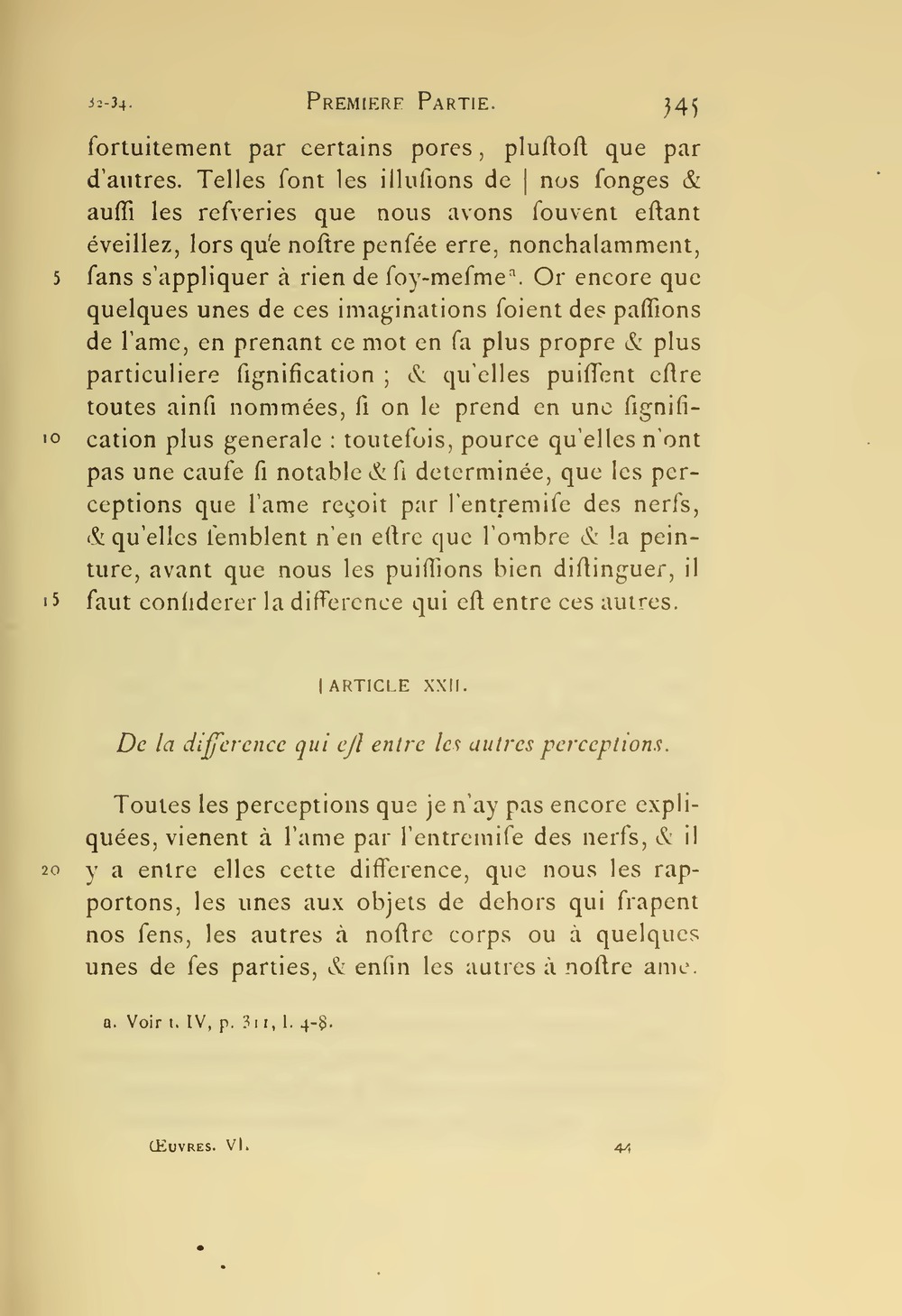 Image haute résolution sur Gallica qu’on nomme sensitive, et la superieure qui est raisonnable ; ou bien entre les appetits naturels et la volonté. Car il n’y a en nous qu’une seule ame, et cette ame n’a en soy aucune diversité de parties ; la mesme qui est sensitive, est raisonnable, et tous ses appetits sont des volontez. L’erreur qu’on a commise en luy faisant jouër divers personages, qui sont ordinairement contraires les uns aux autres, ne vient que de AT XI, 365