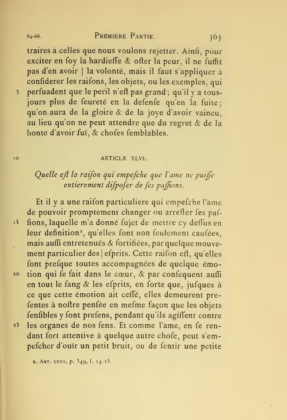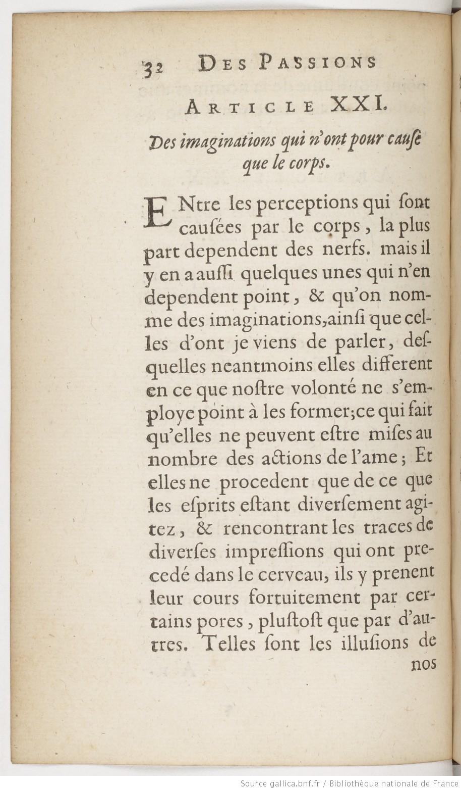 Image haute résolution sur Gallica en l’ame le desir de quelque chose, et celuy dont l’ame la repousse par la volonté qu’elle a de fuïr la mesme chose. Et ce qui fait principalement paroistre ce combat, c’est que la volonté n’ayant pas le pouvoir d’exciter directement les passions, ainsi qu’il a deja esté dit, elle est contrainte AT XI, 366