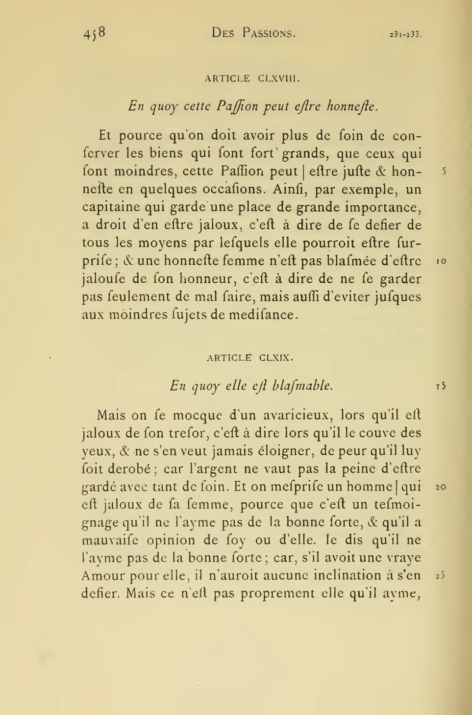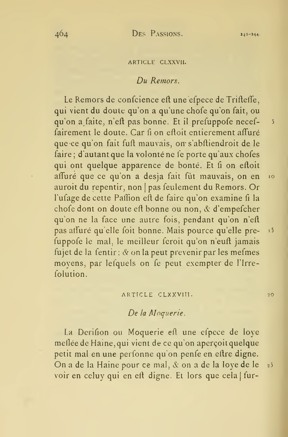 l’ame à se representer la valeur de la chose estimée, laquelle inclination est causée par un mouvement particulier des esprits, tellement conduits dans le cerveau, qu’ils y fortifient les impressions qui servent à ce sujet. Comme, au contraire la Passion du Mespris, est une inclination qu’a l’ame, à considerer la bassesse ou petitesse de ce qu’elle mesprise, causée par le mouvement des esprits, qui fortifie l’idée de cette petitesse.
