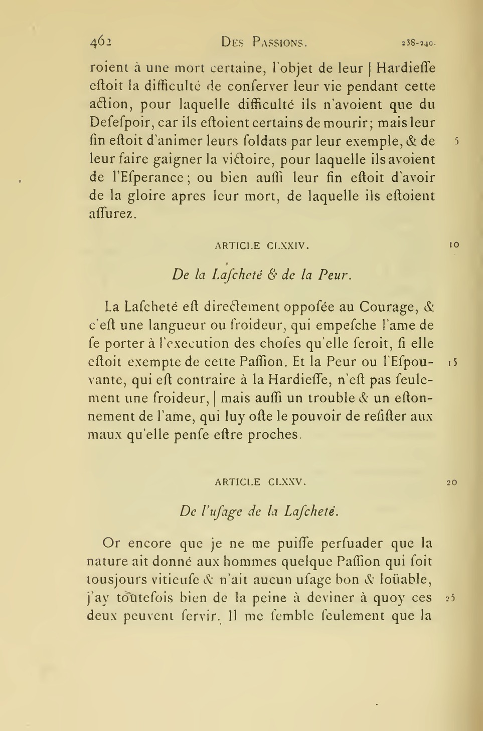 Et c’est la Generosité, et la Foiblesse de l’esprit ou la Bassesse, qui determinent le bon et le mauvais usage de ces deux Passions. Car d’autant qu’on a l’ame plus Le Gras, p. 228![]()