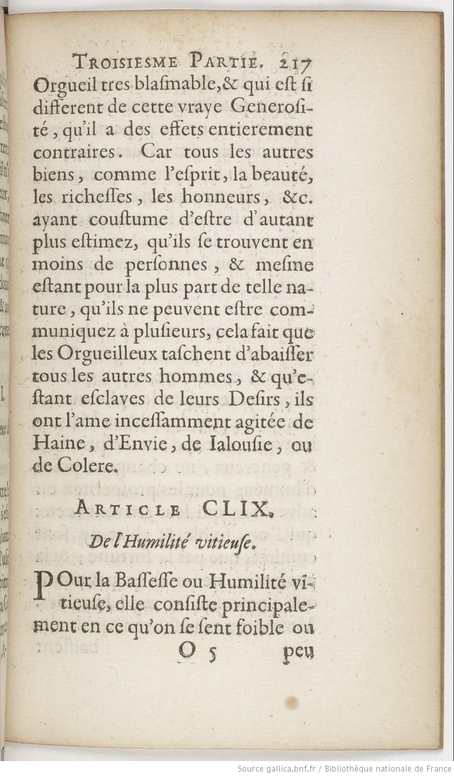 Image haute résolution sur Gallica Orgueil tres blasmable, et qui est si different de cette vraye Generosité, qu’il a des effets entierement contraires. Car tous les autres biens, comme l’esprit, la beauté, les richesses, les honneurs, etc. ayant coustume d’estre d’autant plus estimez, qu’ils se trouvent en moins de personnes, et mesme estant pour la plus part de telle nature, qu’ils ne peuvent estre communiquez à plusieurs, cela fait que les Orgueilleux taschent d’abaisser tous les autres hommes, et qu’estant esclaves de leurs Desirs, ils ont l’ame incessamment agitée de Haine, d’Envie, de Ialousie, ou de Colere.