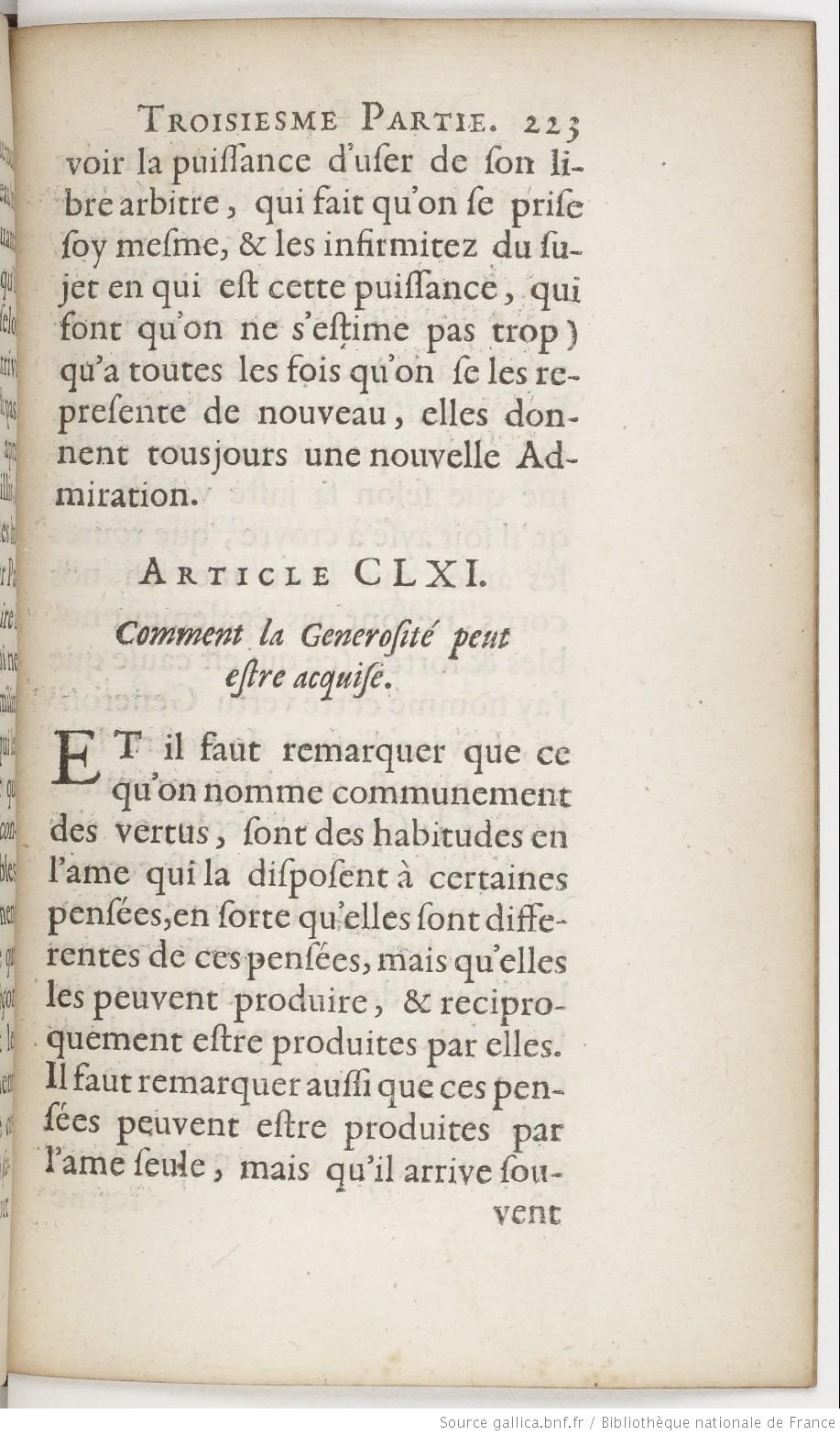 Image haute résolution sur Gallica ferme résolution d’en bien user ; comme aussi d’autre costé, combien sont vains et inutiles tous les soins qui travaillent les ambitieux ; on peut exciter en soy la Passion, et en suite acquerir la vertu de Generosité, laquelle estant comme la clef de toutes les autres vertus, et un remede general contre tous les dereglemens des Passions, il me semble que cette consideration merite bien d’estre remarquée.