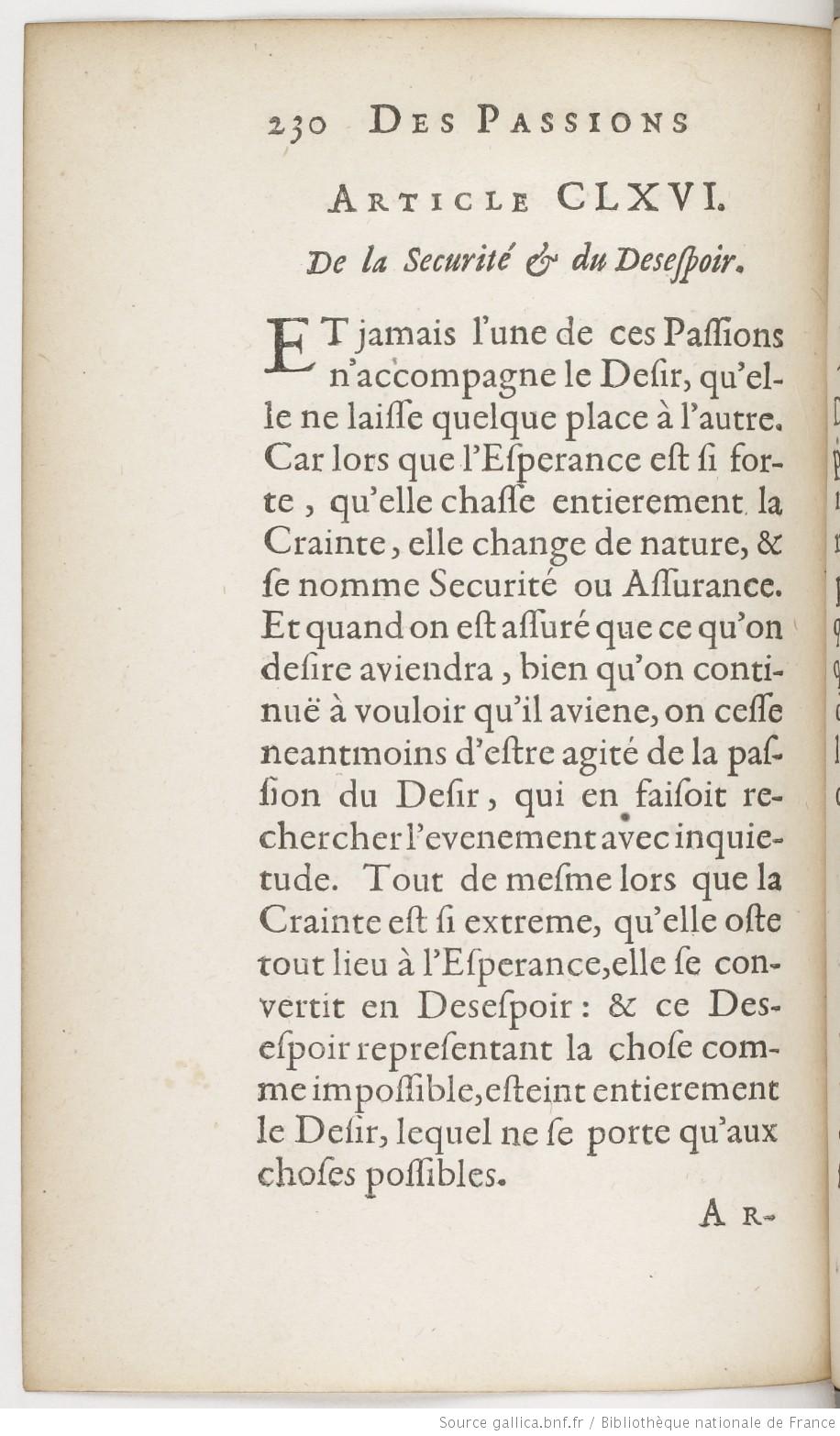 Image haute résolution sur Gallica Car il n’y a personne qui ne s’imagine estant jeune, que la louange est un bien, et l’infamie un mal, beaucoup plus importants à la vie qu’on ne trouve par experience qu’ils sont, lors qu’ayant receu quelques affrons signalez, on se voit entierement privé d’honneur, et mesprisé par un chacun. AT XI, 484