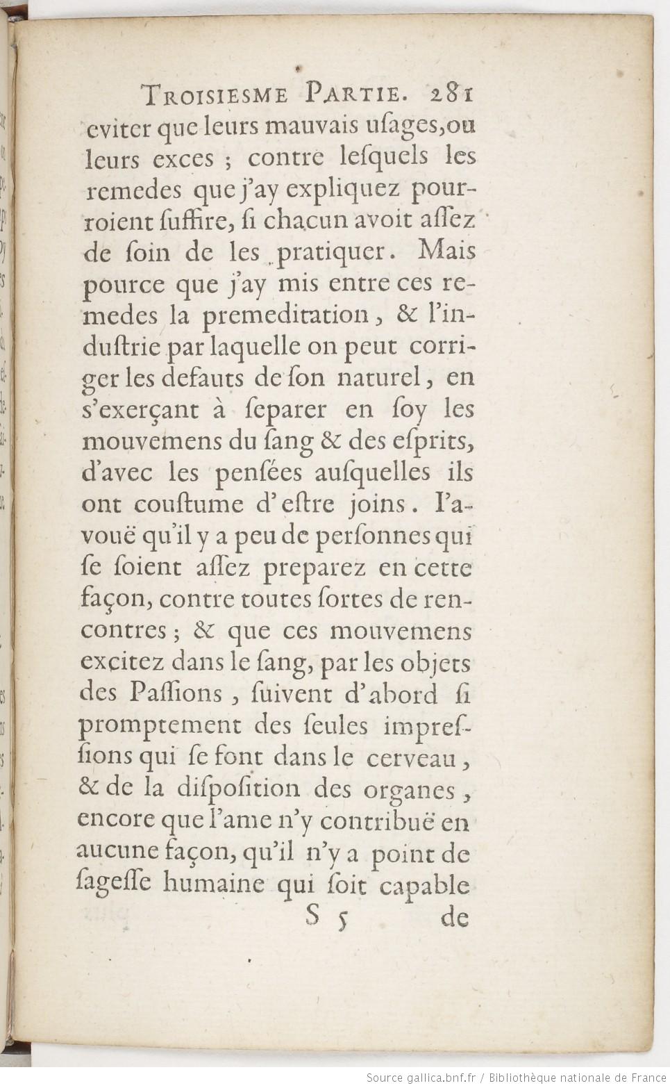Image haute résolution sur Gallica eviter que leurs mauvais usages, ou leurs exces ; contre lesquels les remedes que j’ay expliquez pourroient suffire, si chacun avoit assez de soin de les pratiquer. Mais pource que j’ay mis entre ces remedes la premeditation, et l’industrie par laquelle on peut corriger les defauts de son naturel, en s’exerçant à separer en soy les mouvemens du sang et des esprits, d’avec les pensées ausquelles ils ont coustume d’estre joins. I’avouë qu’il y a peu de personnes qui se soient assez preparez en cette façon, contre toutes sortes de rencontres ; et que ces mouvemens excitez dans le sang, par les objets des Passions, suivent d’abord si promptement des seules impressions qui se font dans le cerveau, et de la disposition des organes, encore que l’ame n’y contribuë en aucune façon, qu’il n’y a point de sagesse humaine qui soit capable Le Gras, p. 282![]()