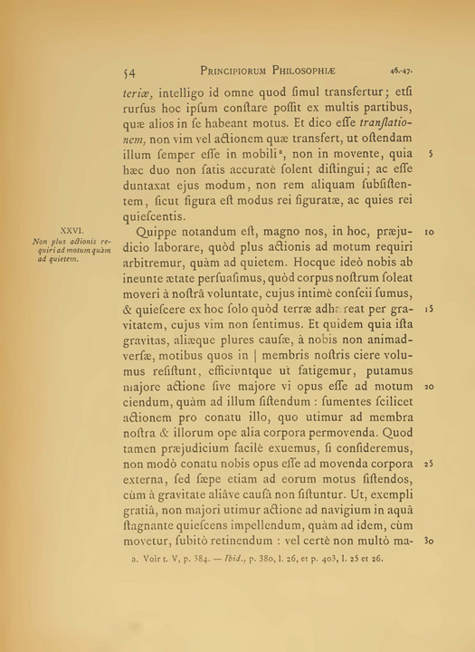 XXVI. Non plus actionis requiri ad motum quàm ad quietem.Quippe notandum est magno nos, in hoc, praejudicio laborare, quòd plus actionis ad motum requiri arbitremur, quàm ad quietem. Hocque ideò nobis ab ineunte aetate persuasimus, quòd corpus nostrum soleat moveri à nostra voluntate, cujus intimè conscii sumus, et quiescere ex hoc solo, quòd terrae adhaereat per gravitatem, cujus vim non sentimus. Et quidem quia ista gravitas, aliaeque plures causae à nobis non animadversae, motibus, quos in Elzevier, p. 47![]()