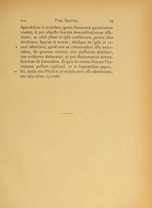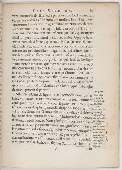 figurabilem et mobilem, quàm Geometrae quantitatem vocant, et pro objecto suarum demonstrationum assumunt ; ac nihil planè in ipsa considerare, praeter istas divisiones, figuras et motus ; nihilque de Elzevier, p. 70![]()